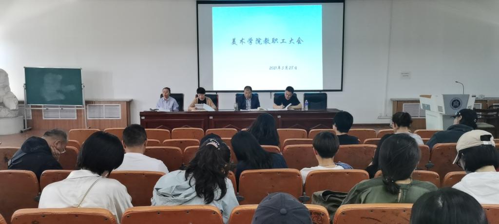 5月28日下午,美术学院在美术楼四楼阶梯教室召开了全体教职工大会。会议由美术学院副院长高特木乐主持,党总支书记包旭东、党总支副书记吴利春、副院长塔娜以及全体教职工、外聘教师50多人参加了本次会议。