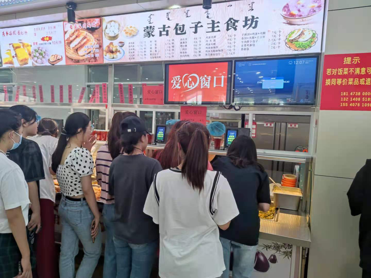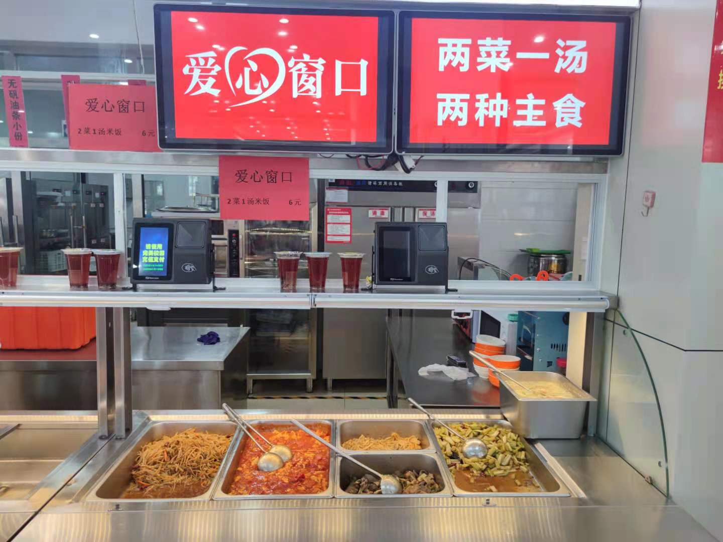为保证学校每位同学都能吃饱吃好,学校提供政策支持帮扶,学校餐饮服务中心在南、北食堂开设“爱心窗口”,为同学们提供美味菜品,服务莘莘学子。每个爱心窗口每餐安排5道热菜、2种主食、1种汤,每天不重样,中午与晚上皆开放,学生们可自选2菜1主食1汤,自选爱心套餐每人只需支付6元。爱心窗口现已开设半个月,来就餐同学络绎不绝,每天平均卖出300余份爱心餐。