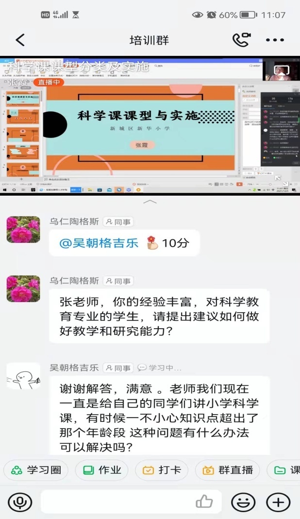 张霞老师以“科学课课型与实施”为题目,从教学设计、课堂管理、启发式教学等多方面给学生做了一次精彩的讲座。专题讲座后,张霞老师与学生进行了深入的讨论与互动,在线为学生答疑解惑,得到了学生们得广泛好评。