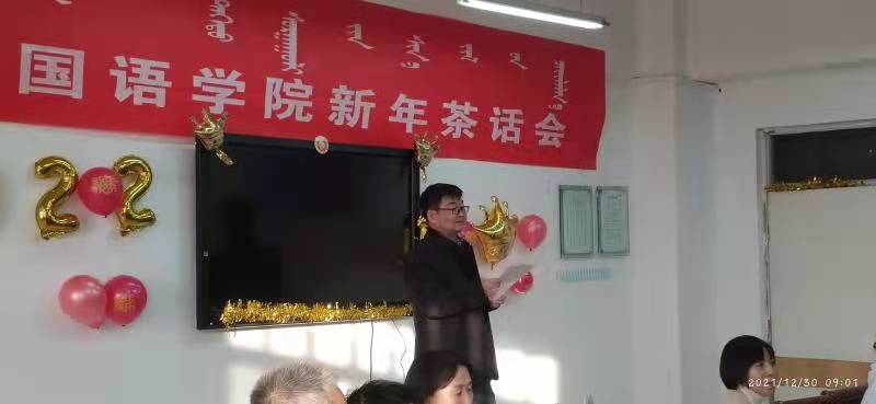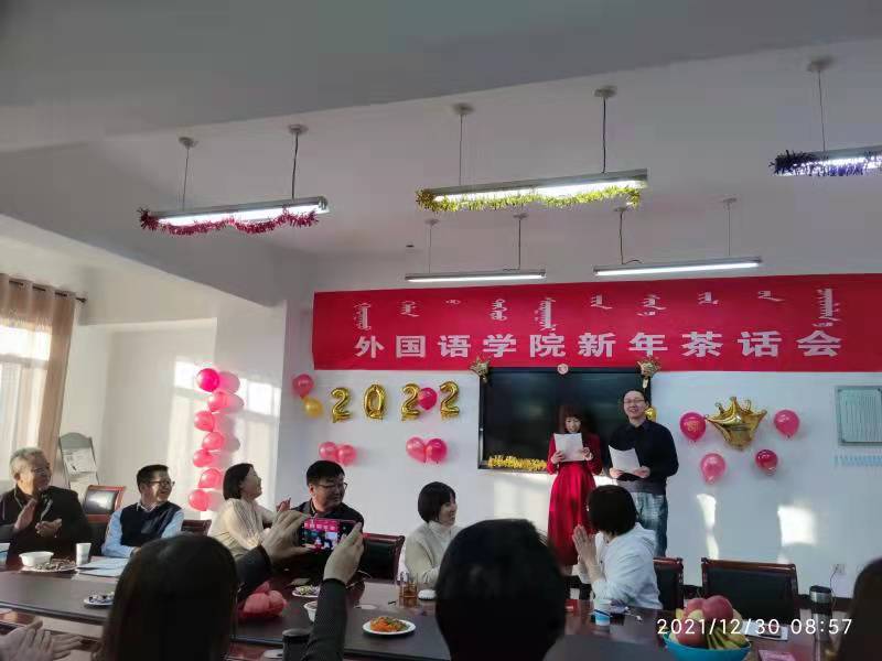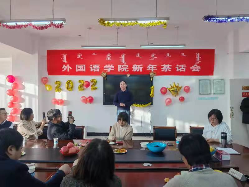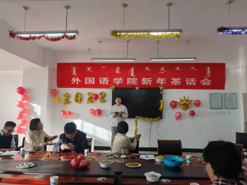 活动伊始,由布日古德书记和肖查娜院长代表学院对全体教师致以贺词,对我院全体教师过去一年的辛勤付出给予肯定和感谢并送上真挚的新年祝福。随后,教师代表潘兴安、胡日查毕力格以及学生代表吕广杰分别为此次茶话会献上动听的歌曲,“句子接龙”“交头接耳”“谁是卧底”等充满乐趣的游戏和获奖礼物盲选等环节为茶话会增添了浓浓的节日氛围。