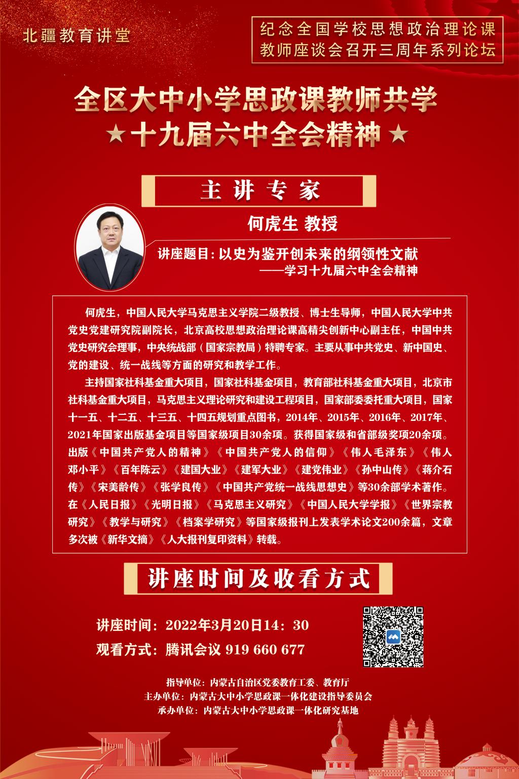 3月20日下午,北疆教育讲堂邀请中国人民大学何虎生教授作了题为《以史为鉴开创未来的纲领性文献——学习十九届六中全会精神》的专题辅导讲座,best365组织全体思政课教师在线收看。