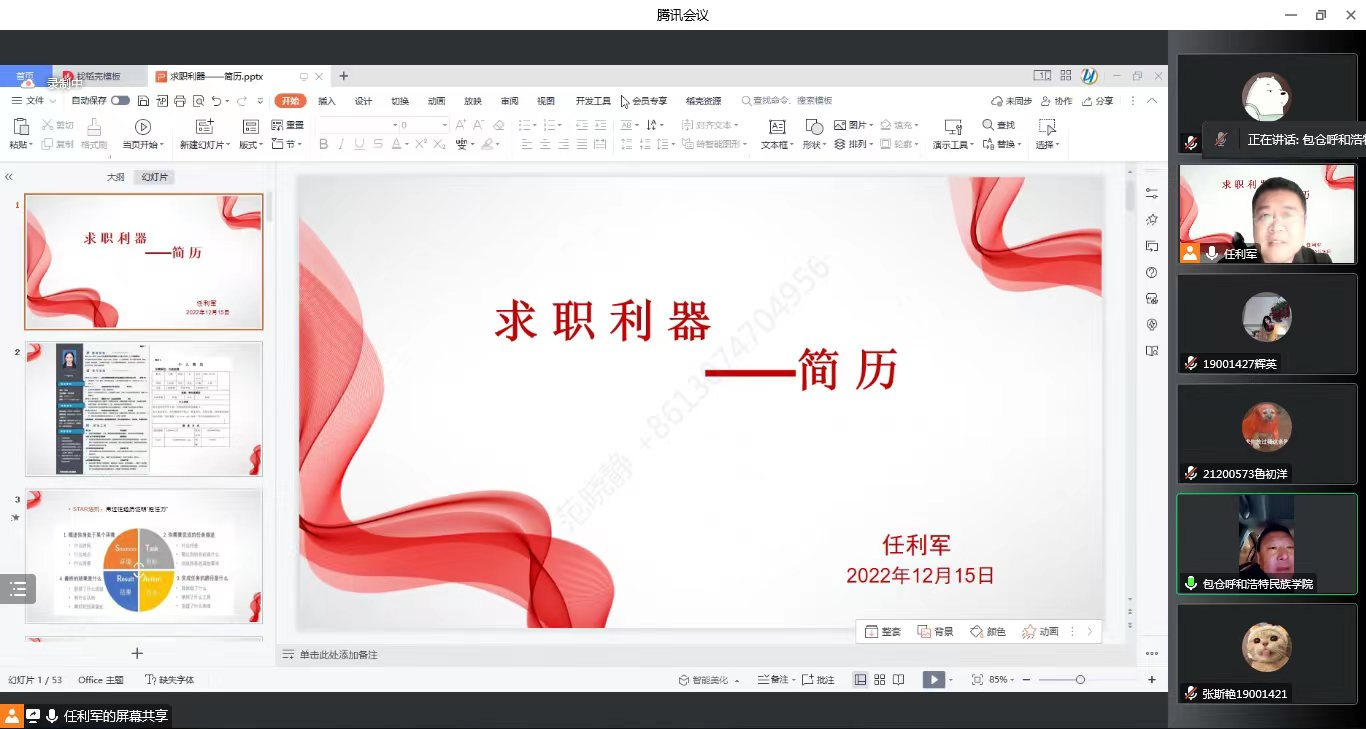 任利军在分析疫情影响下就业环境和形势的同时,首先从简历的基本信息、求职意向、教育背景等内容为同学们详细解释说明。其次从仪容仪表、心理准备和求职态度为同学们讲解关于面试需要注意的事项,从面试的主要形式、面试的流程、面试前的准备要素、面试考官的高频度提问、面试结束的收官流程等进行了重点介绍。最后,任老师还为同学们进行了现场答疑并为同学们指出了明确的方向。