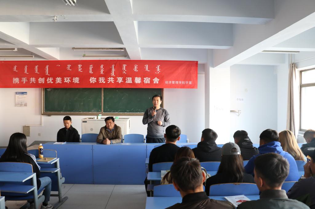 为推进“不忘初心、牢记使命”主题教育,加强学生宿舍的管理,督促学生养成良好的卫生习惯。11月8日中午,经济管理学院在306举办“宿舍文化月”活动启动仪式。经济管理学院党总支书记赛音图、副书记乌日根巴雅尔、团总支书记李延茂、专职辅导员邵建朝和我院各宿舍舍长、各班班长参加此次启动仪式。仪式由李延茂老师主持。