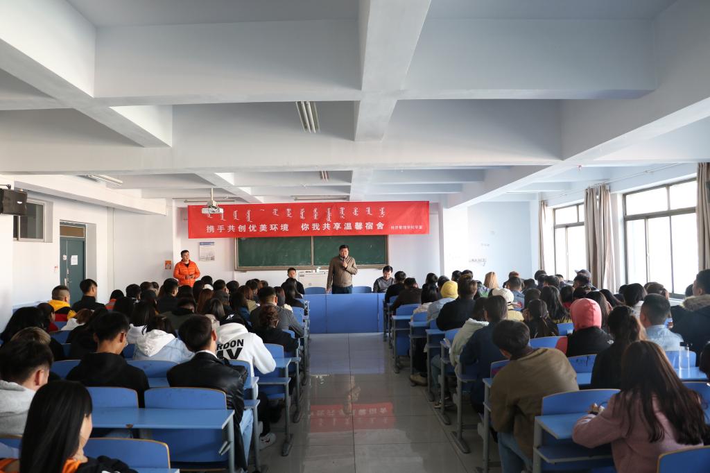 活动开始,专职辅导员邵建朝老师宣读了《经济管理学院宿舍文化月活动策划书》,并传达了本次活动对学生宿舍卫生的具体要求。随后由学生干部代表和优秀宿舍代表上台发言,强调保持宿舍卫生的重要性,表决心将在宿舍文化月活动中起到表率作用。学生代表发言后,乌日根巴雅尔老师对宿舍文化月活动的方案做了解读,对班长和宿舍长的职责做了明确部署。最后,党总支书记赛音图作了总结发言,强调了宿舍文化月活动开展的意义,对学生干部们给予了支持和鼓励。