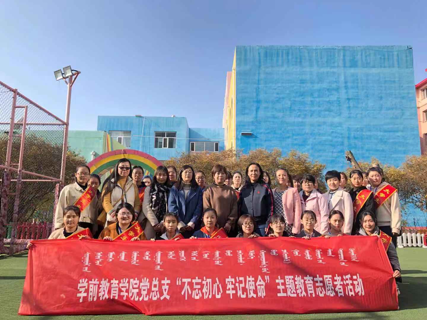 在“不忘初心、牢记使命”主题教育开展之际,11月8日上午10时学前教育学院党总支书记娜仁其木格带领教师党员和学生到新城区第一幼儿园开展志愿者服务活动。