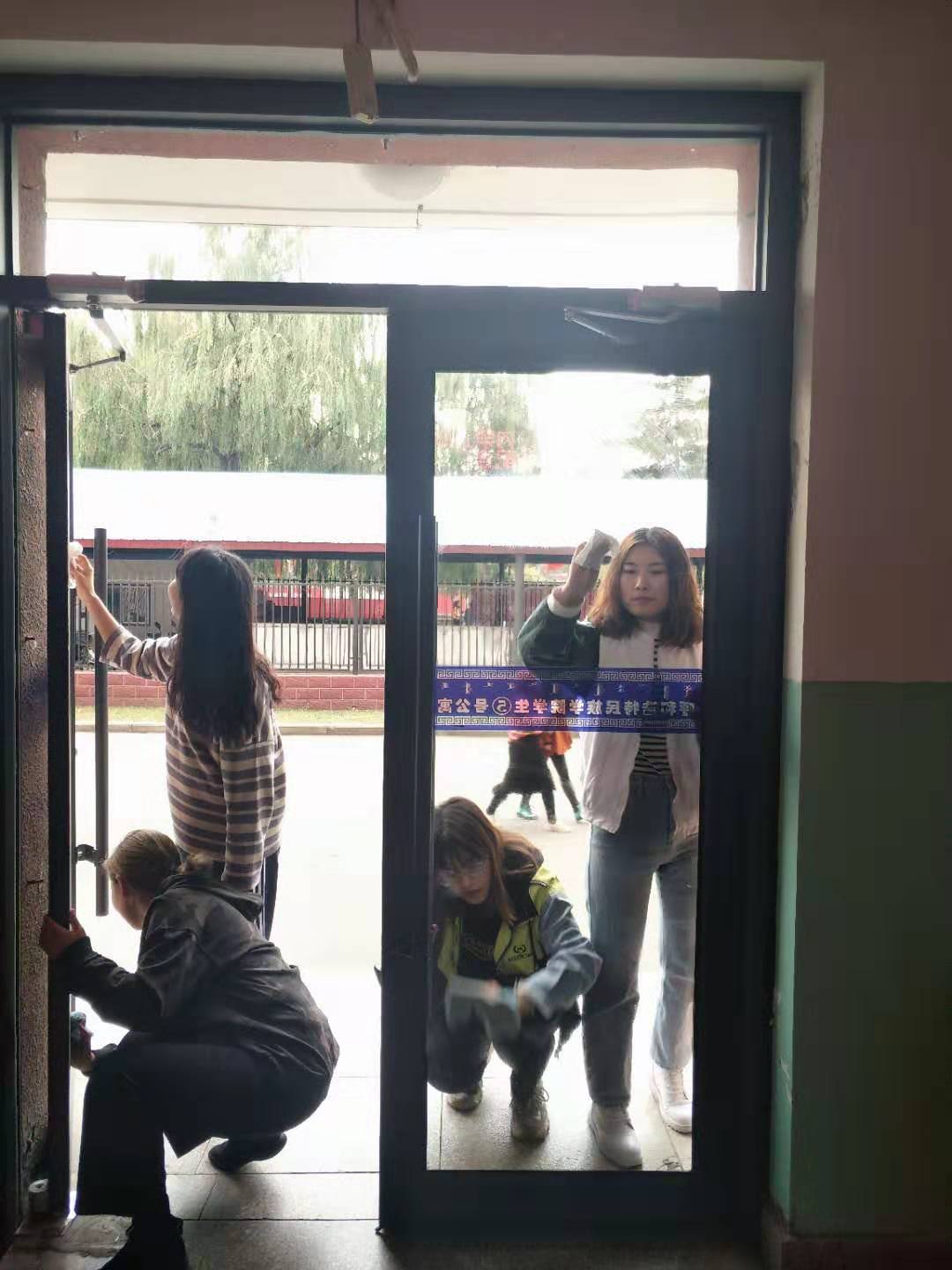 擦拭公寓楼楼门玻璃
