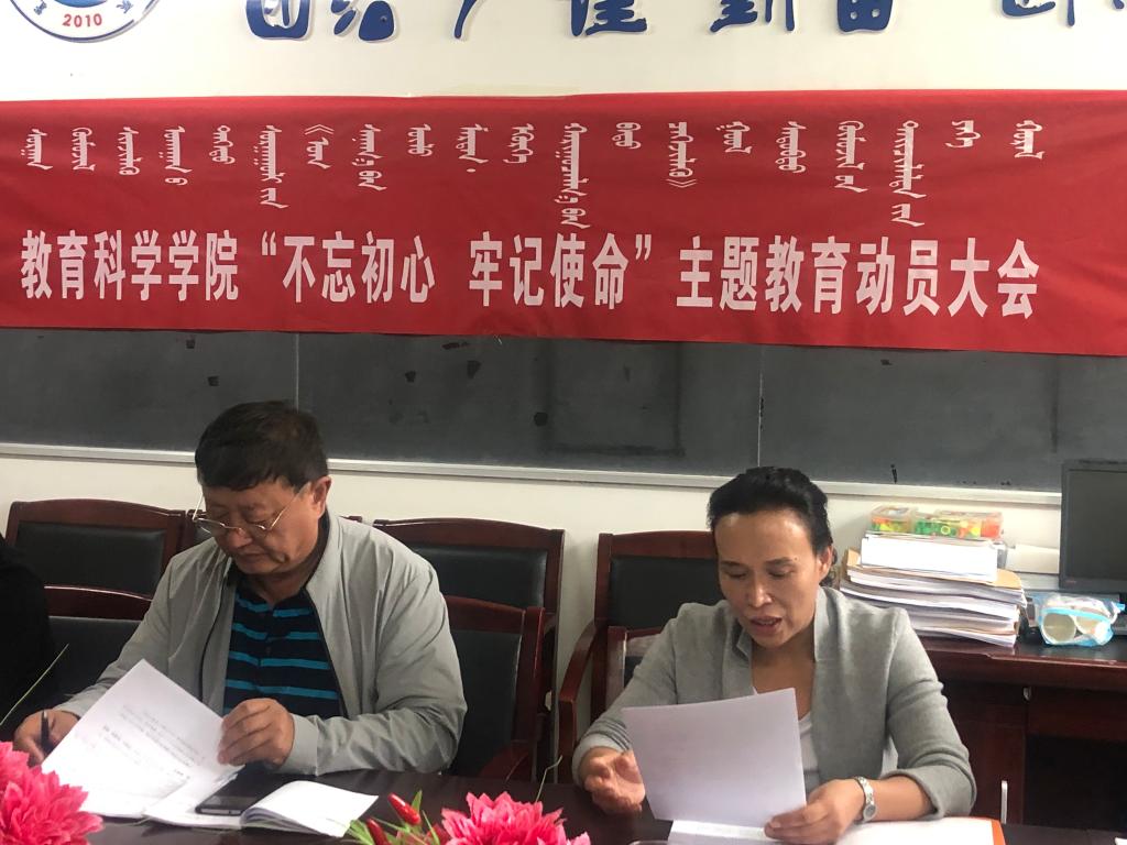 首先,在动员部署会议上,党总支副书记娜仁其木格代表学院传达了学校“不忘初心、牢记使命”主题教育动员会会议精神。
