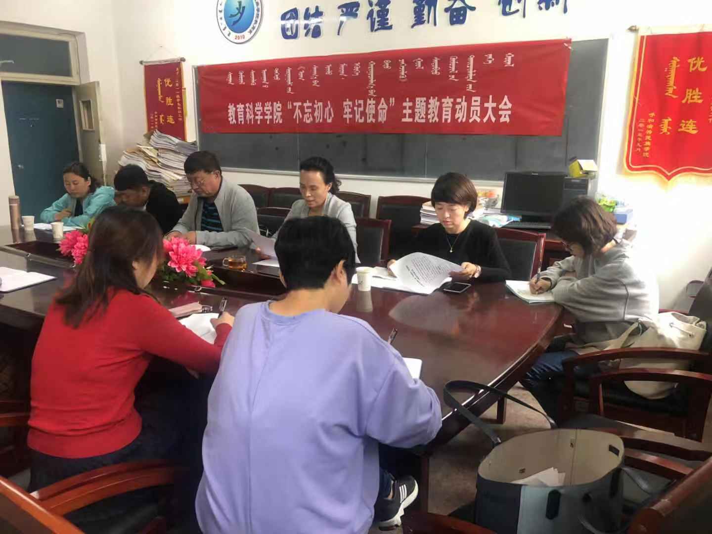 9月19日上午9点,在教育科学学院会议室举办“不忘初心、牢记使命”主题教育动员部署会议,best365“不忘初心、牢记使命”主题教育第二指导组组长胡日查老师、吴丽春老师出席本次会议,党总支副书记娜仁其木格、各支部书记及委员、学生党员代表参加此次会议,教工支部书记许晓芳主持会议。