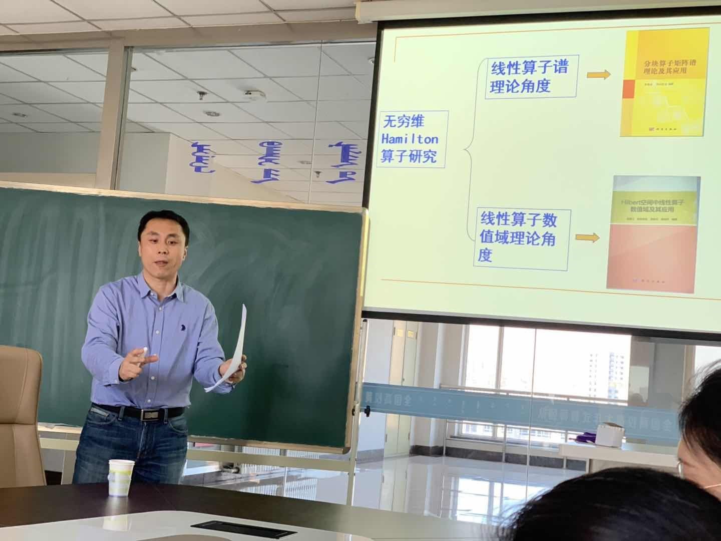 吴德玉教授在讲座中介绍从开普勒三大定律、牛顿二体运动方程到哈密尔顿正则系统、钟万勰院士创立的弹性力学求解新体系、冯康院士提出的辛几何算法以及当代数学界和力学界亟待解决的理论问题“非自伴算子理论” 等方面与无穷维Hamilton算子的联系,让大家充分认识到了无穷维Hamilton算子理论的重要性。随后,吴教授对无穷维Hamilton算子理论研究的两大角度,即吴德玉教授与阿拉坦仓教授等合作出版的两部专著《线性算子谱理论》和《线性算子数值域理论》进行简要介绍,并重点对线性算子数值域理论角度对涉及的基本概念、方法、性质等方面结合实例进行了形象生动的讲解。
