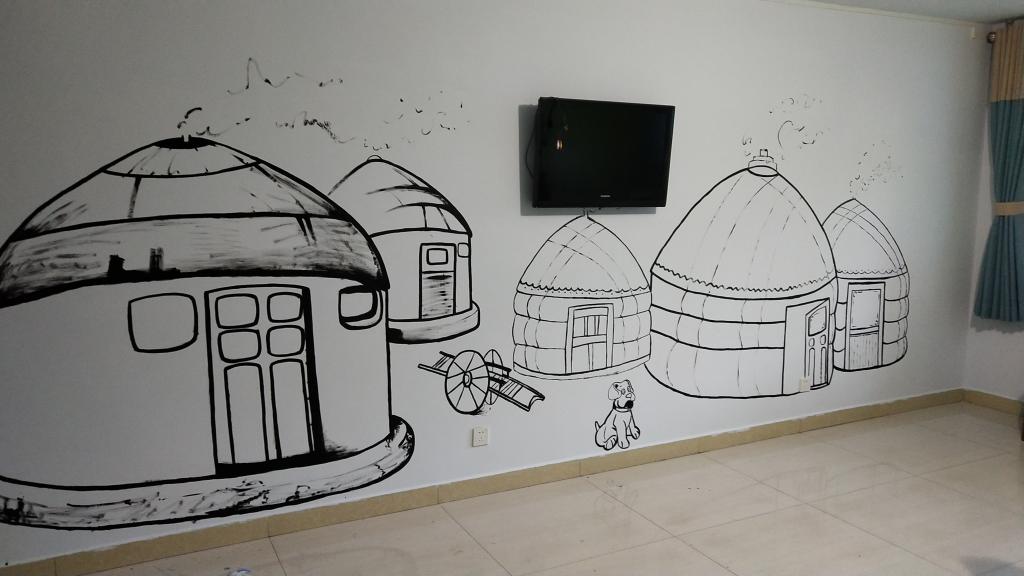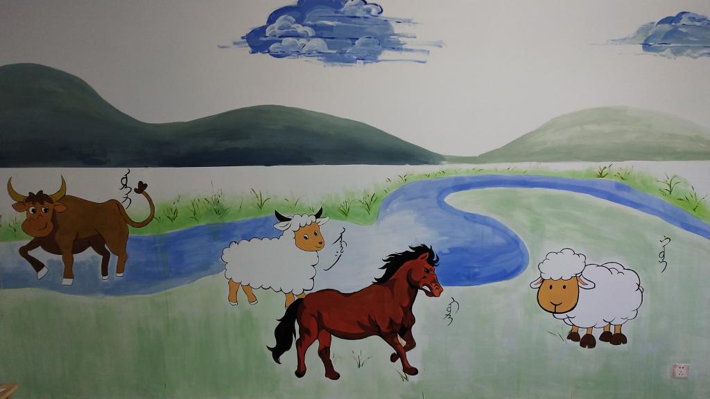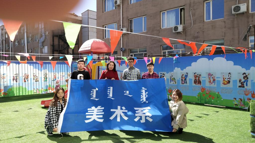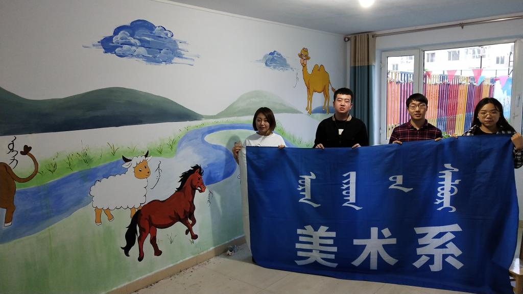 本次活动充分发挥了美术系学生的专业特长,同学们为这所幼儿园墙体描绘出民族文化特色的图案,从孩子的视野角度出发,在墙面上生动描绘了内蒙古地区的民族特色风貌以及草原上生活的动物,使从小生活在城市里的蒙古族小朋友能够感受到草原的风貌,为孩子的心中种下民族团结的种子。