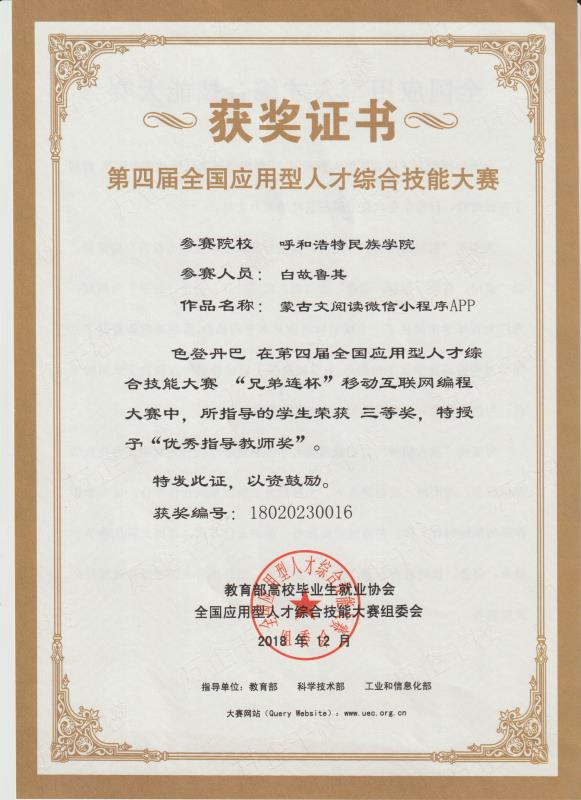 比赛现场,各参赛队通过ppt演示、现场操作、答辩等环节展示了创新项目。经过两天的比拼,最终评选出一等奖6个、二等奖24个、三等奖28个。best365选手充分发挥学校特色和专业优势,用出色的技术、完整的演示和详细的回答赢得评委的青睐,最终《蒙古文阅读微信小程序APP》项目脱颖而出获得大赛三等奖。