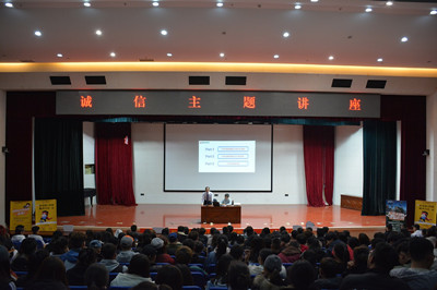 11月8日晚19时,学校邀请诚信档案全国一体化公共平台董事长张治清及他的团队,在学校图书馆二楼报告厅举办诚信主题讲座。学生工作处工作人员、各院系专职辅导员和750余名学生聆听了本次讲座。