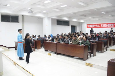 为深入学习宣传贯彻党的十九大精神,学习好、宣传好、贯彻好习近平新时代中国特色社会主义思想,计算机系于11月12日在都林楼116室开展了“青春喜迎十九大,不忘初心跟党走”主题演讲比赛。计算机系团总支书记白银亮、蒙古语言文学系学生会主席朝宝力高、汉语言文学系学生会主席张勇、广播站站长娜仁、计算机系学生会主席许天龙、副主席于佳伶及计算机系全体学生会干部观看了比赛。