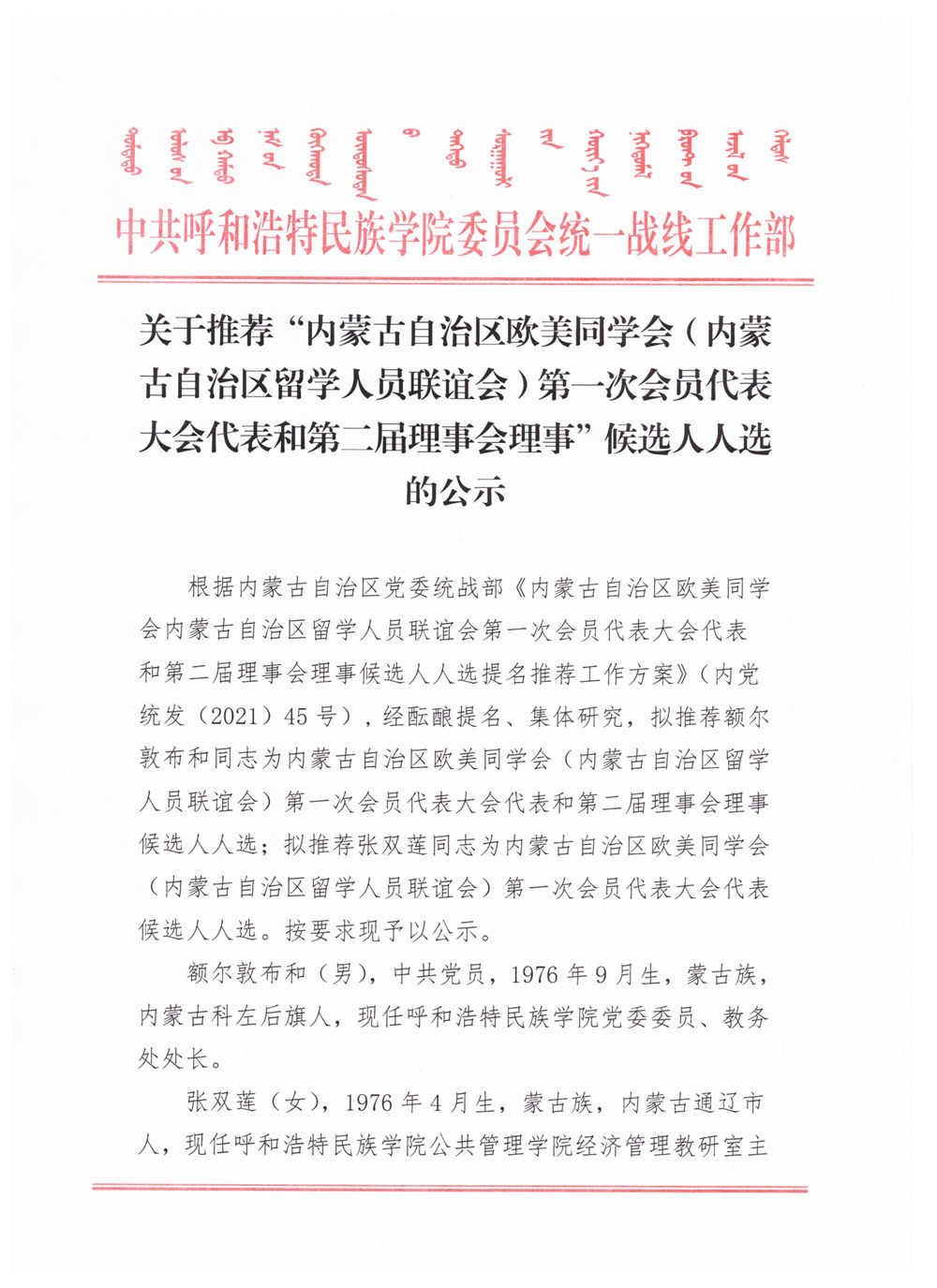 关于推荐“内蒙古自治区欧美同学会(内蒙古自治区留学人员联谊会)第一次会员代表大会代表和第二届理事会理事”候选人人选的公示
