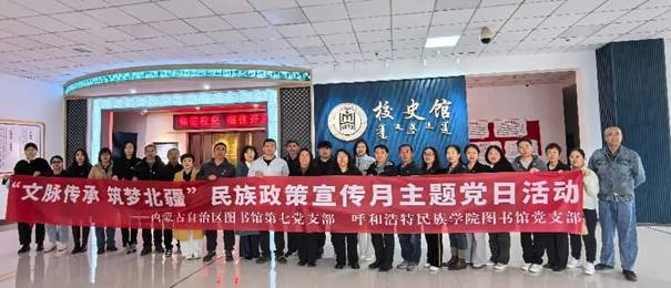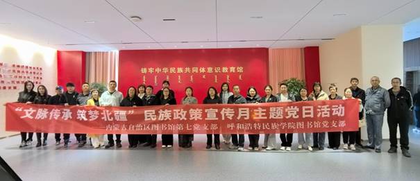 为深入学习贯彻习近平总书记关于加强和改进民族工作的重要思想,扎实开展民族政策宣传教育,5月9日,图书馆党支部与内蒙古自治区图书馆第七党支部携手开展了“文脉传承 筑梦北疆”民族政策宣传月主题党日活动,两支部共26名党员参加活动。