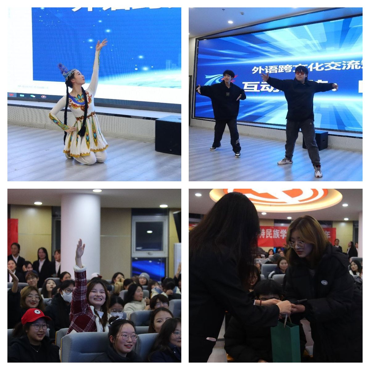 展演过程中,李丽同学带来的新疆《铃铛舞》使观众体会到舞姿中所流露出的民族风情,展现了力量与激情的碰撞;学校艺术团Flame Dance舞团带来的爵士舞《not shy》,用青年人的热情和激情填满整个会场,展现了青年大学生自由奔放、热情洋溢的风格;2023级新生代表张璐瑶、阿日古玛带来的朗诵《风雨同舟民院人,共庆民院七十载》,表达了学子对母校的感恩之心,并以学子的赤诚向学校70周年校庆庄严献礼。互动环节中“几棵柳树扭几扭”、“校庆知识随机问答”、“自由表演——科目三”等项目,多次将活动推向高潮。
