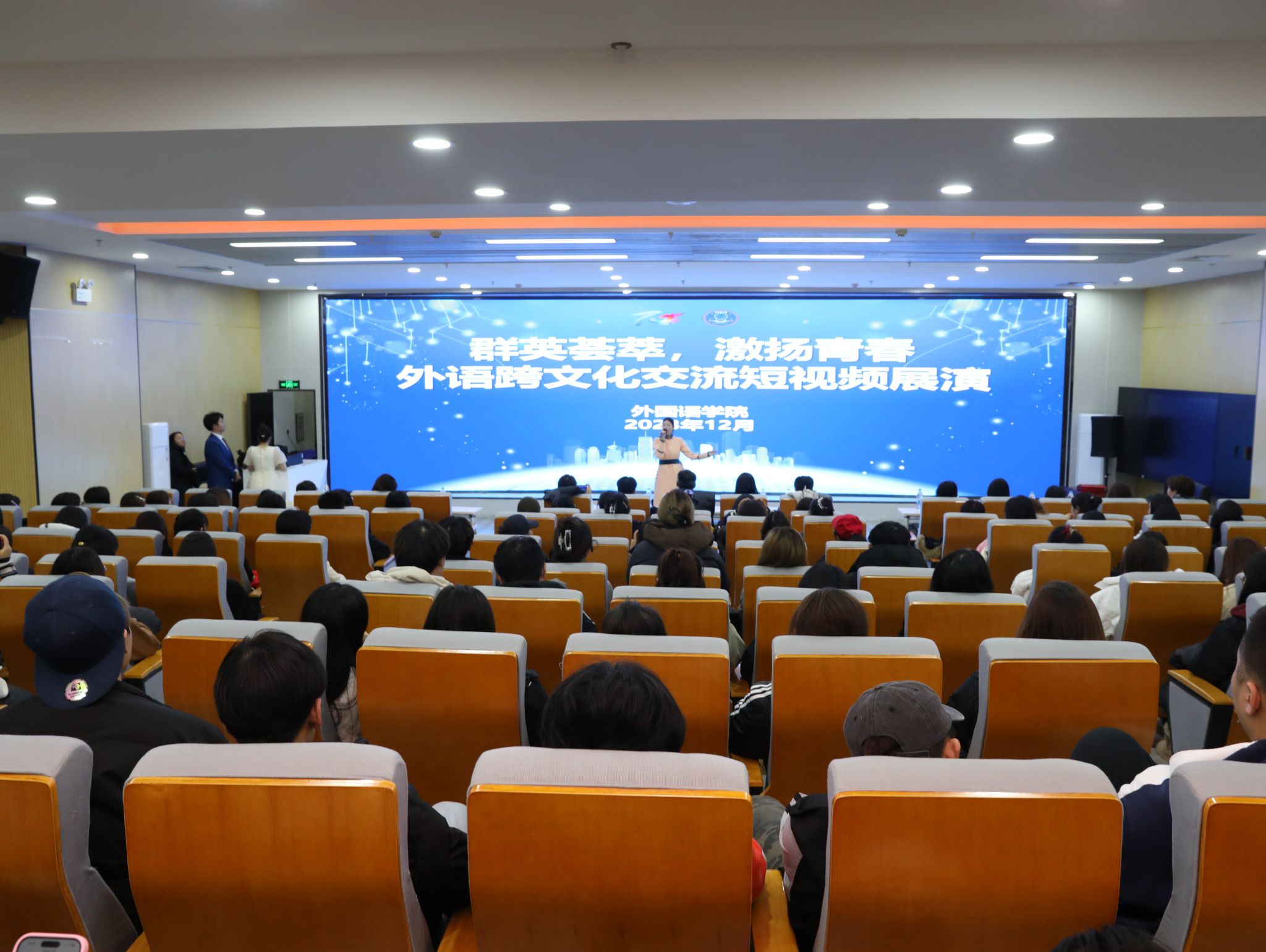 为营造积极向上、和谐健康的校园文化氛围,激发学生爱校荣校的荣誉感和使命感,以良好青春风貌向校庆70周年献礼,外国语学院于12月12日晚在北院图书馆一楼报告厅举办“群‘英’荟萃,激扬青春——外语跨文化交流短视频展演”活动。学院领导班子、任课教师代表和学生代表出席活动。