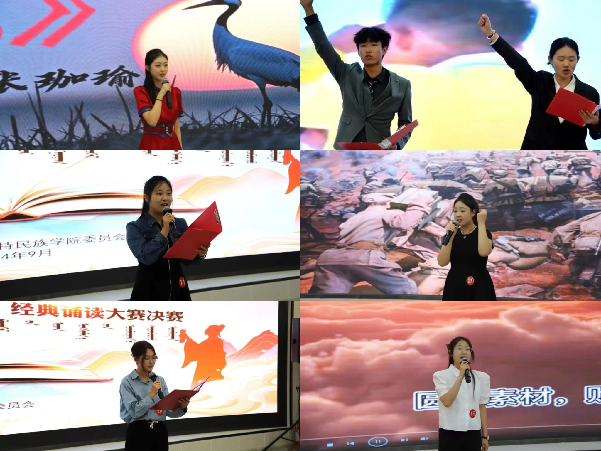 贯彻落实第27届全国推广普通话宣传周工作要求,加大国家通用语言文字推广力度,9月24日,校团委在北图书馆一楼报告厅举办了“典耀中华”经典诵读大赛决赛。本次大赛的评委由包冬梅、乌兰哈斯、乌云其木格、王丽华、柴静老师担任,师生代表共170余人参加了此次大赛。