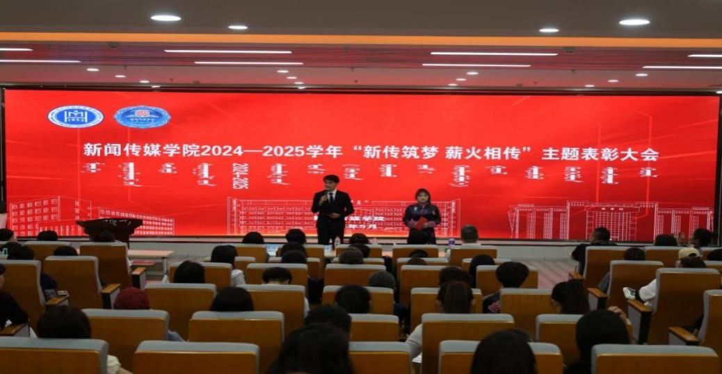 5月26日,新闻传媒学院“新传筑梦 薪火相传”主题表彰大会在北院图书馆一楼报告厅举行。新闻传媒学院党总支书记苏伦高娃、院长额尔敦毕力格、党总支副书记王丽、副院长安迎春,以及专业教师、班主任、辅导员、获奖学生代表共150余人参加。