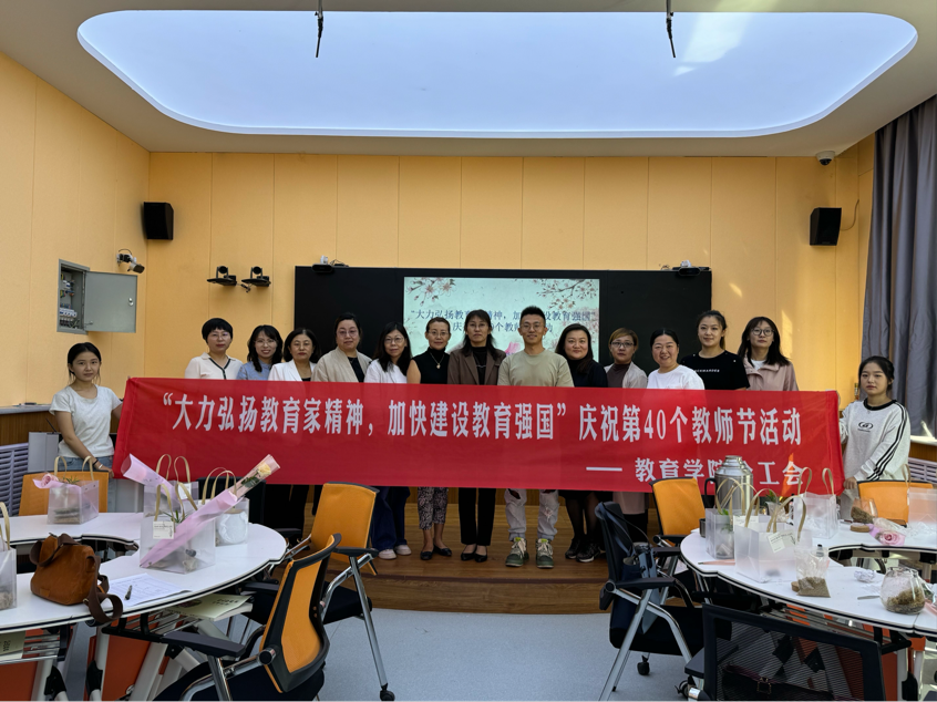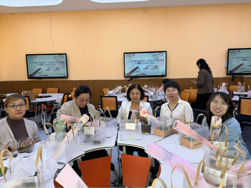 “大力弘扬教育家精神,加快建设教育强国”庆祝第40个教师节活动 ——教育学院分工会 为庆祝第40个教师节教育学院于24年9月10日上午在逸夫楼多功能教室开展“大力弘扬教育家精神,加快建设教育强国”主题活动,活动现场老师们亲手栽种的一花一木,一草一木,不仅是对自然界生命奥秘的探索与致敬,更是对学生们成长之路的深刻隐喻,正如老师们以无尽的耐心与智慧,悉心浇灌每一颗求知的心田。以盆栽形式传达对老师们的美好祝福。