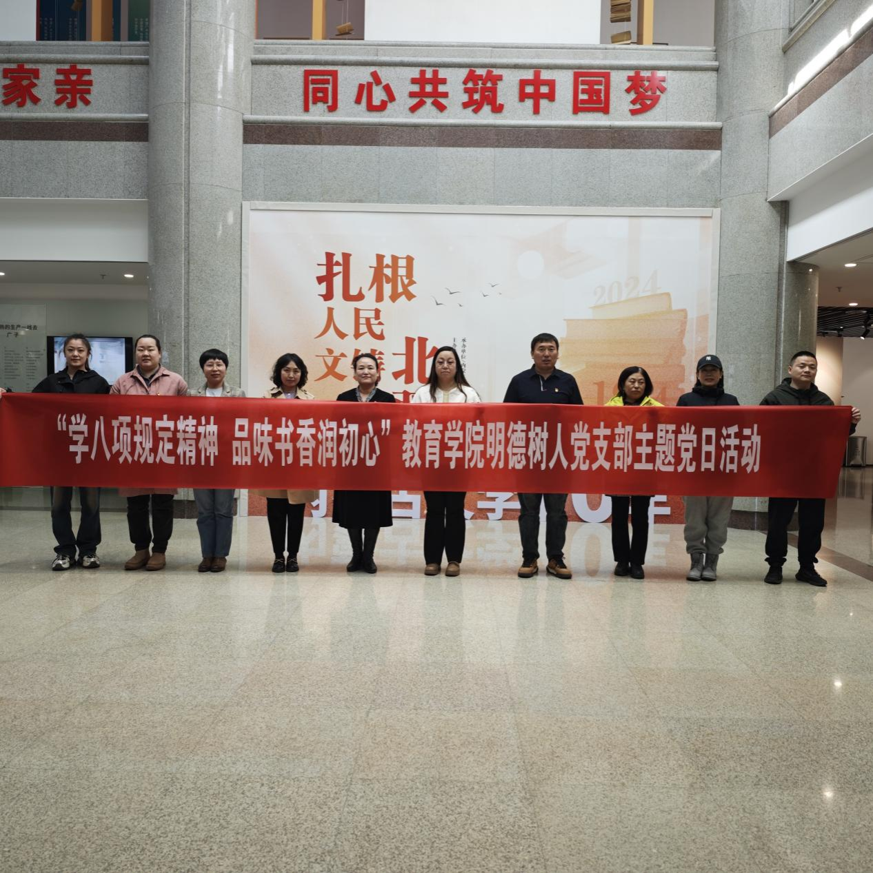 为深入贯彻落实全面从严治党要求,进一步加强党风廉政建设,4月24日下午,教育学院明德树人党支部前往内蒙古文学馆开展中央八项规定精神学习教育主题党日活动,活动由党支部书记梅花主持。