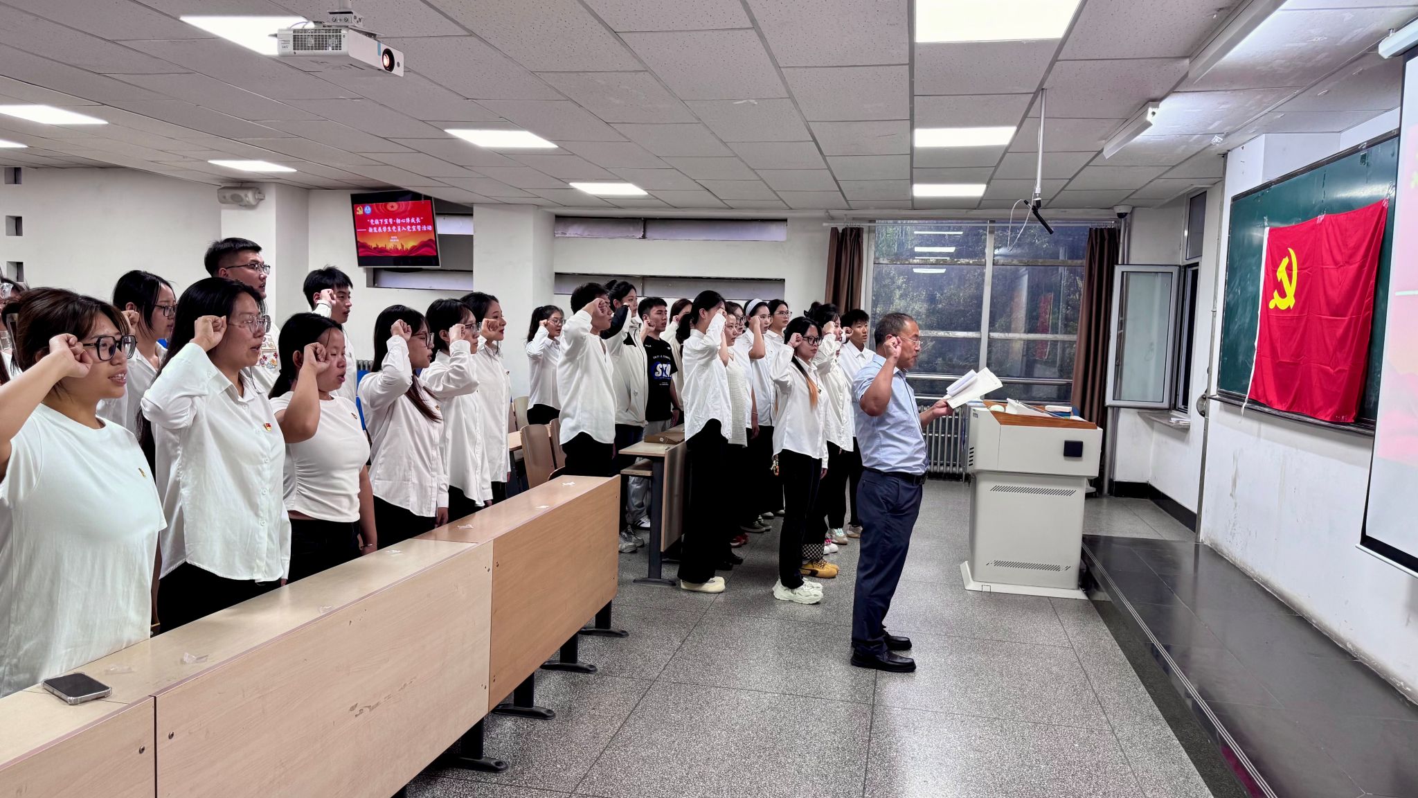 引导新发展学生党员坚定理想信念,强化党员身份意识与责任担当,9 月 16 日,在尚智楼314教室举行学生党员入党宣誓活动。学生第一党支部书记樊寒伟老师、在校党员及全体新发展学生党员参加了此次活动。