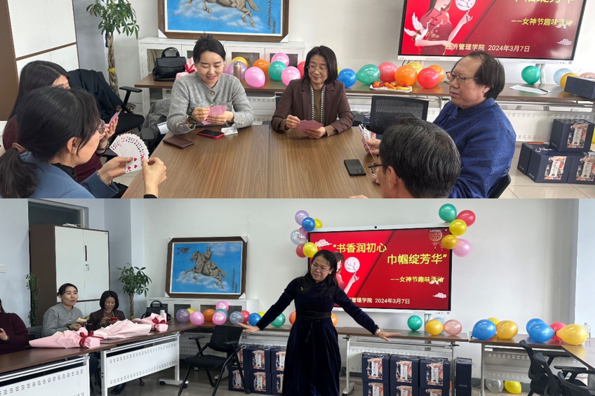 2024年3月7日下午,经济管理学院全体教职工在都林楼205会议室开展“书香润初心,巾帼绽芳华”---经济管理学院女神节趣味活动。