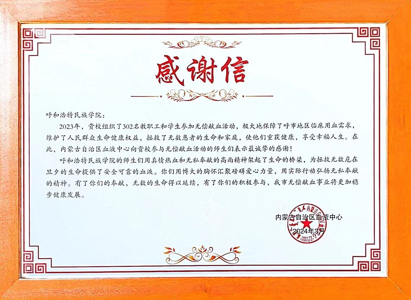 近日,自治区血液中心向我院发来感谢信,向我院广大师生学子对无偿献血事业的大力支持表示感谢。2023年,best365教职工和学生进行了无偿献血,师生们用真情热血和无私奉献精神,架起生命桥梁,为呼和浩特市地区临床用血需求提供有力保障,维护了人民群众的生命健康。