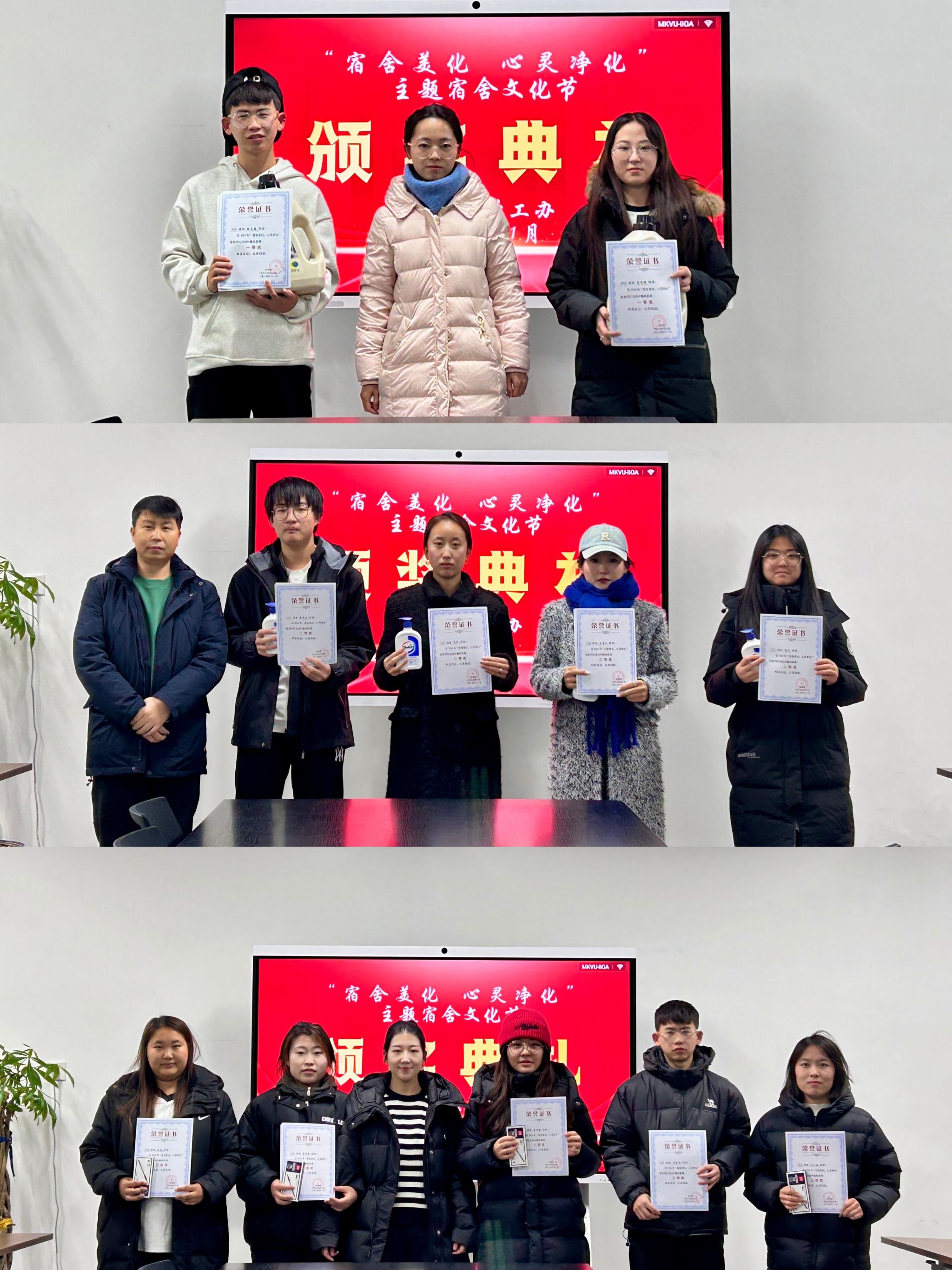 本次宿舍评比涵盖宿舍卫生环境、物品摆放规范、电器合规使用、宿舍成员和谐相处等多个方面,旨在综合评估宿舍的卫生、安全和文化建设。经宿管阿姨评分、学生会生活部评分及学院老师评分,最终共评出一等奖3间宿舍,二等奖5间宿舍 ,三等奖6间宿舍。