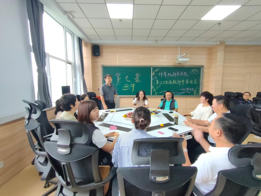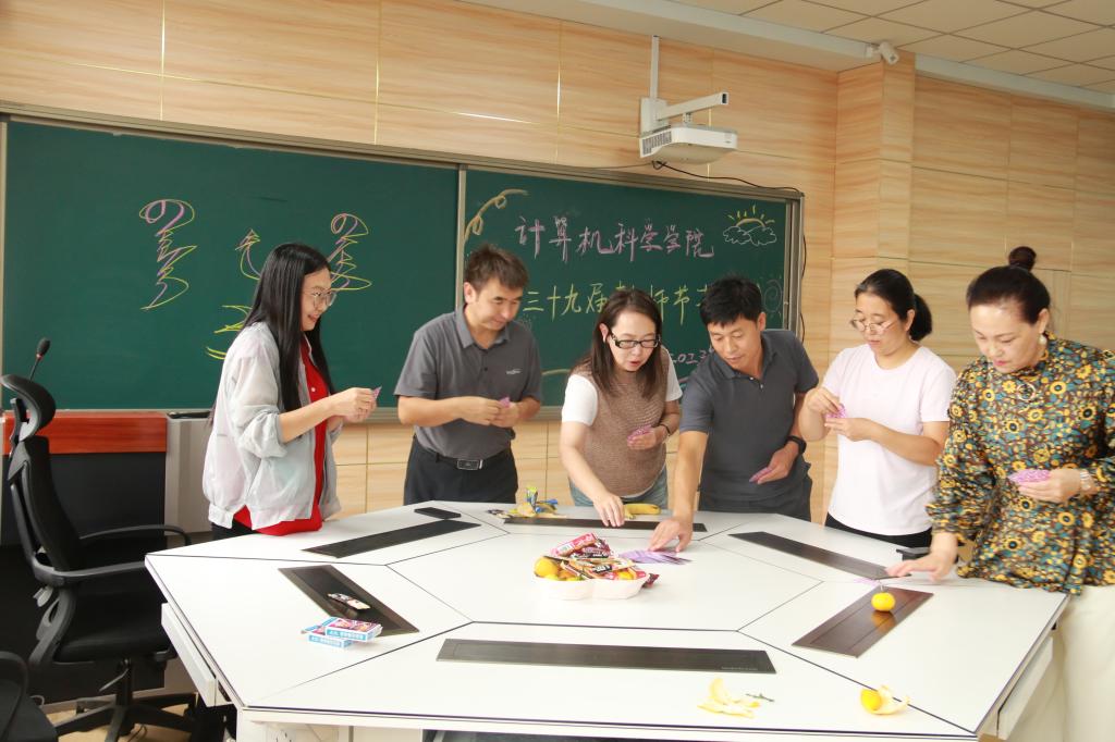 2023年9月8日下午,在第39个教师节来临之际,计算机科学学院在综合楼908会议室开展了庆祝教师节活动。老师们首先围坐在一起畅谈教书育人的经验、和学生之间生动的故事,接着开展了娱乐活动,在活动中放松的心情,加深了情感。