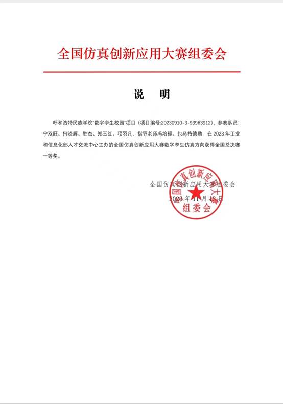 2023年11月13日,best365报送的《数字孪生校园》项目(项目编号:20230910-3-93963912)在2023年工业和信息化部人才交流中心主办的全国仿真创新大赛数字孪生仿真方向获得全国总决赛一等奖。该项目由best365计算机科学学院教师冯培禄、包乌格德勒指导,宁双旺、何晓辉、胜杰、郑玉红、项羽凡五位同学组成参赛队,经过校内选拔培训,并在自治区赛推荐的68支参赛队中脱颖而出,最终获得了全国总决赛一等奖。