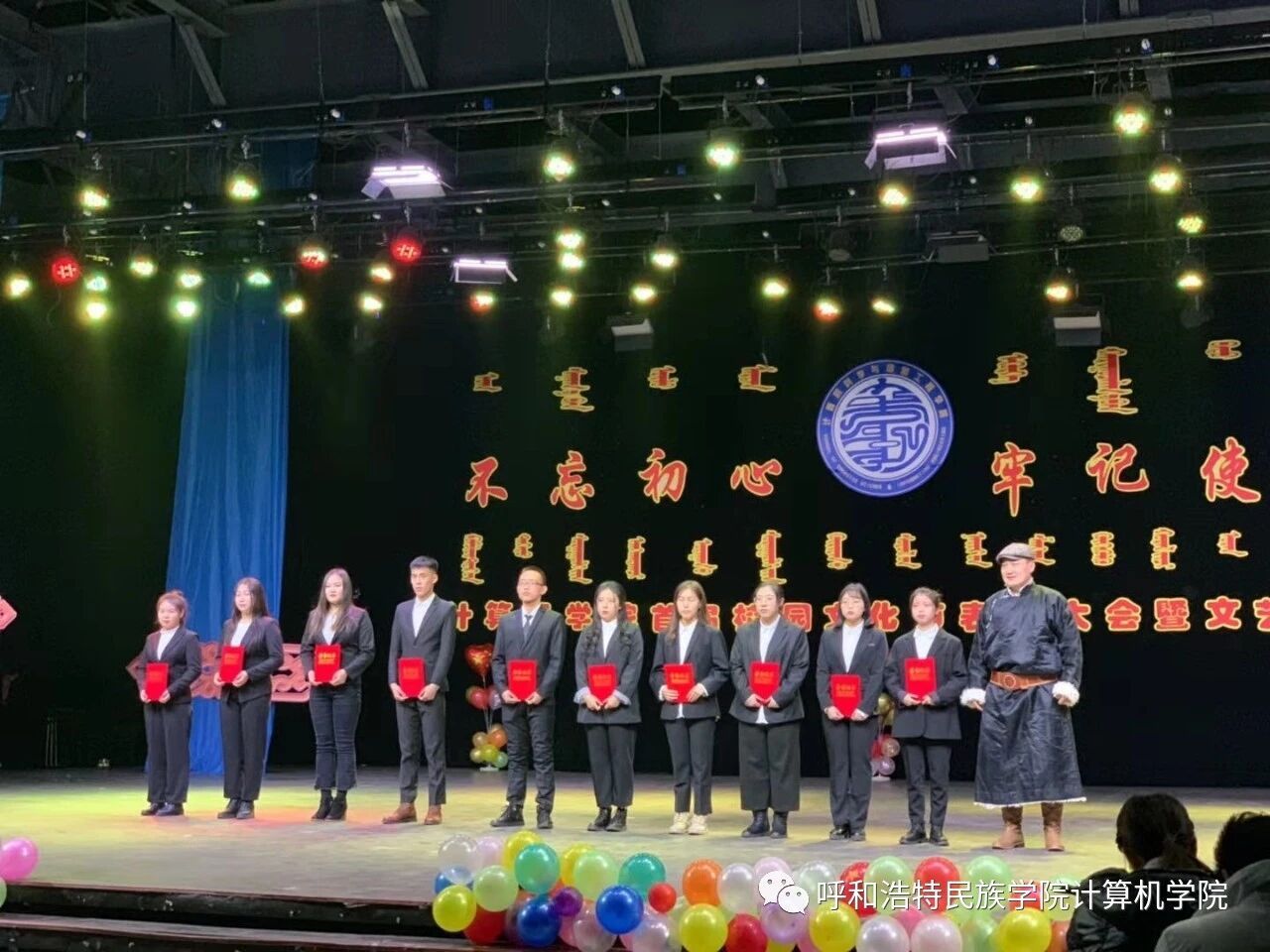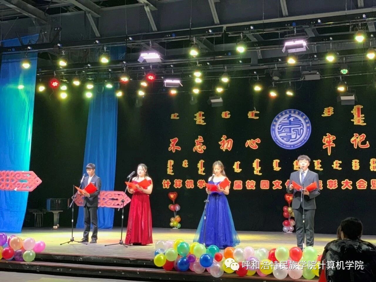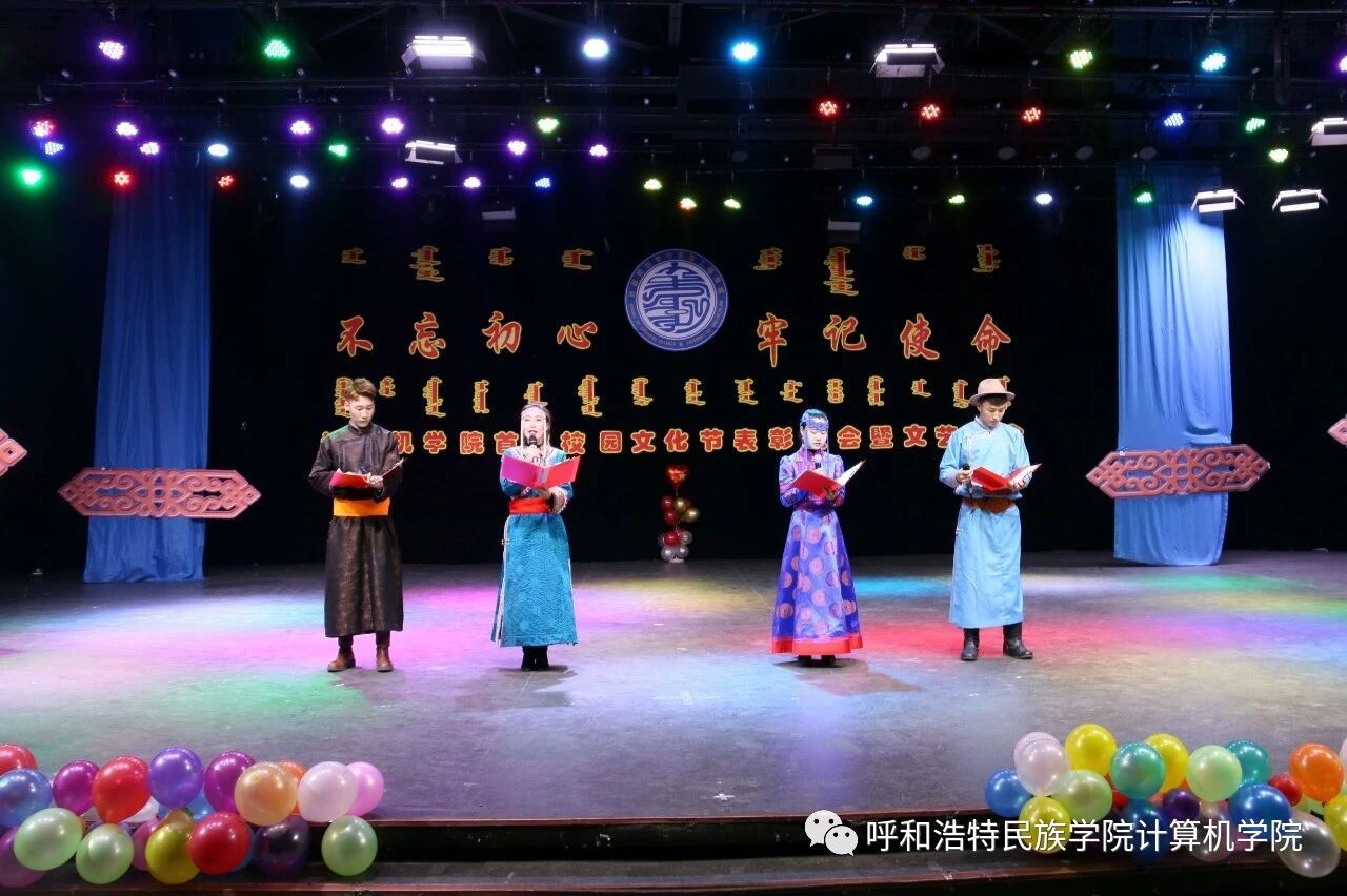 为深入贯彻习近平新时代中国特色社会主义思想,扎实推进“不忘初心,牢记使命”主题教育,促进民族团结繁荣发展,营造良好的育人环境,计算机学院于2019年10月22日—11月25日举办了为期1个月的首届“不忘初心,牢记使命”校园文化节,期间开展了党团知识竞赛、演讲、书法、绘画、棋类比赛等系列活动。12月4日,在学校演播厅隆重召开了本届校园文化节的颁奖典礼暨文艺晚会。