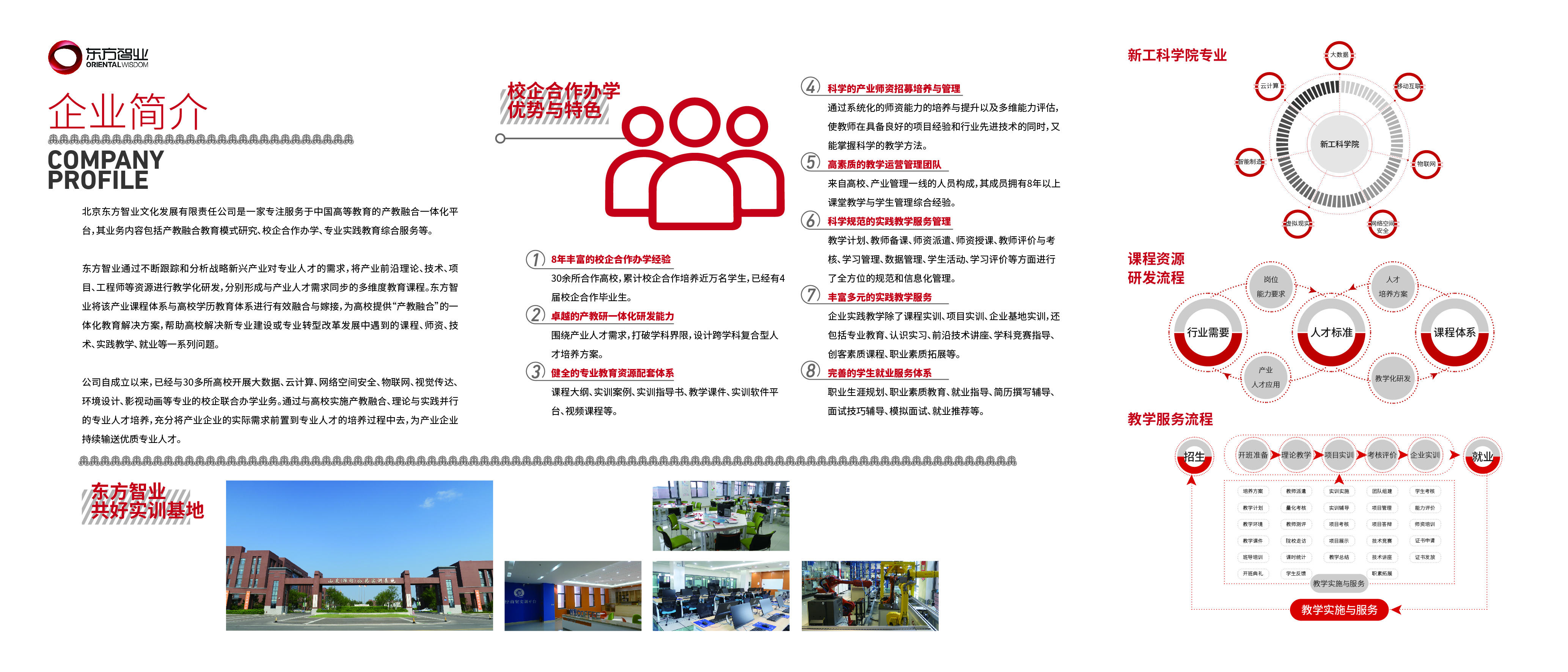 东方智业通过不断跟踪和分析战略新兴产业对专业人才的需求,为高校提供“产教融合”的一体化教育解决方案,帮助高校解决新专业建设或专业转型改革发展中遇到的课程、师资、技术、实践教学、就业等一系列问题。目前,公司已经与30多所高校开展大数据、云计算、网络空间安全、物联网、视觉传达、环境设计、影视动画等专业的校企联合办学业务,并为产业企业持续输送优质专业人才,受到企业的一致好评及教育主管部门的认可。