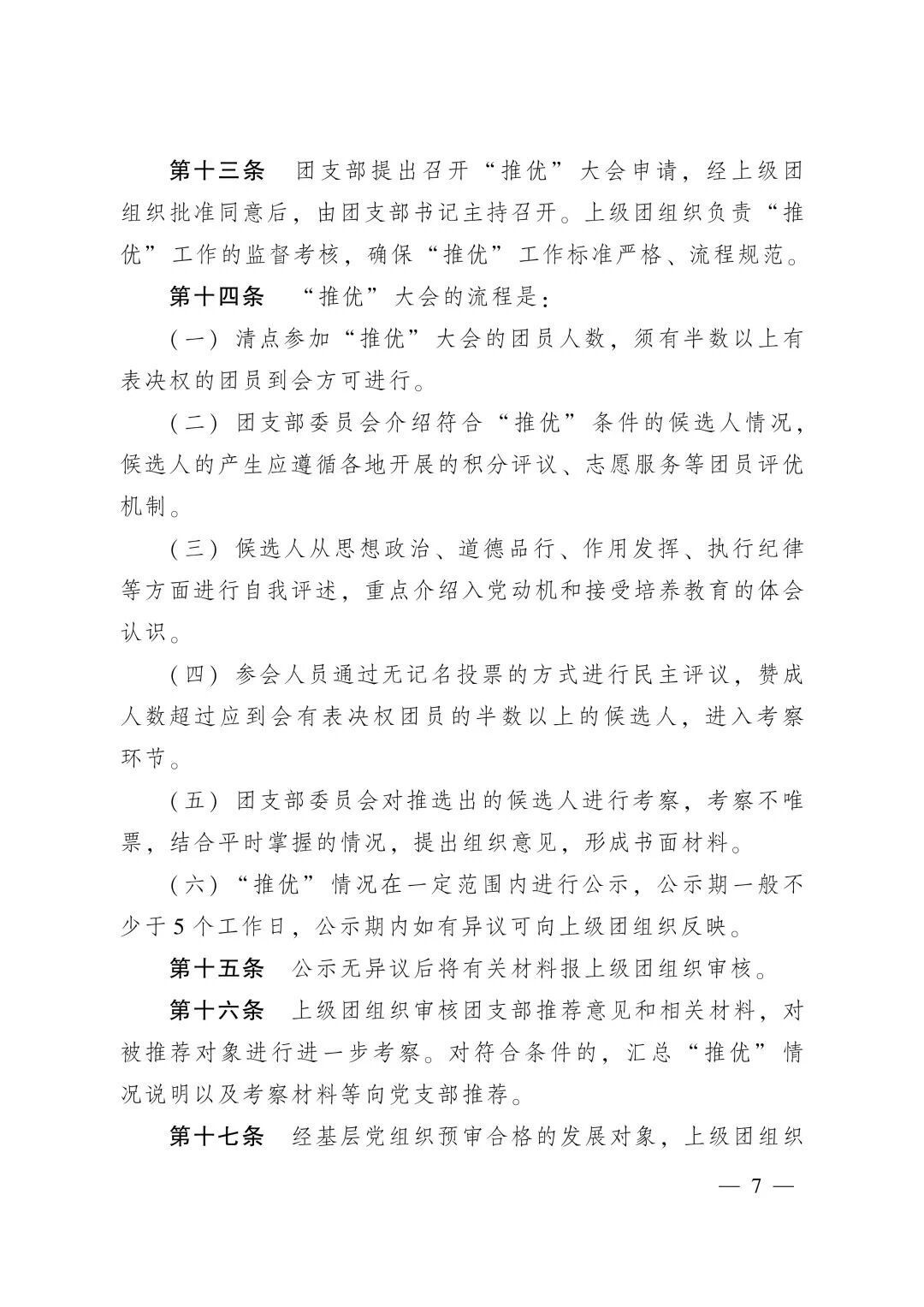 第十三条 团支部提出召开“推优”大会申请,经上级团组织批准同意后,由团支部书记主持召开。上级团组织负责“推优”工作的监督考核,确保“推优”工作标准严格、流程规范。