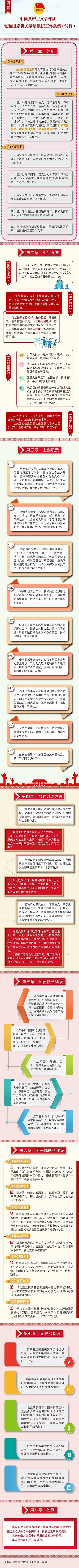 《条例》深入贯彻落实习近平新时代中国特色社会主义思想,贯彻落实习近平总书记关于青年工作的重要思想,充分吸收了近年来机关团的工作的理论、实践和制度创新成果。全文共分为八章,36条,5000余字。第一章“总则”,明确了机关基层团组织的定位,并提出了条例出台的目的、指导思想和工作原则等。第二章“组织设置”,规范了机关基层团组织及其委员会的设置,明确了委员会的组成、数量、选举任期和换届要求。第三章“主要职责”,结合形势要求和工作实际,统筹提出机关团委、团总支、团支部等基层团组织基本职责。第四章“加强政治建设”,聚焦党和国家机关首先是政治机关,对基层团组织加强政治建设进行了强调,并提出具体要求。第五章“团员队伍建设”,对团员教育、组织生活、管理服务、作用发挥、推优入党、举荐人才、发展团员等进行了规定。第六章“团干部队伍建设”,对团干部的配备、班子建设、作风建设等方面进行了规定。第七章“领导和保障”,规范了机关党团关系,明确了工作责任等。第八章“附则”,明确了参照适用单位、解释单位和实施时间。