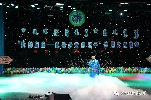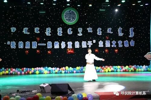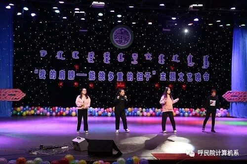 为深入学习宣传贯彻习近平新时代中国特色社会主义思想和党的十九大精神,认真贯彻落实团的十八大精神,促进各民族师生之间的感情和友谊,增强民族凝聚力和向心力,丰富校园文化生活,12月25日计算机系举办了“我的肩膀—能挑多重的担子”主题文艺晚会。
