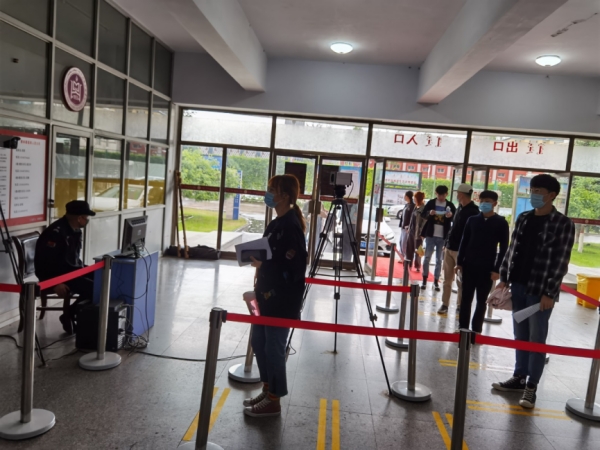 考生入场时,严格按照学校疫情防控规章制度保持1米间隔,有序排队,经红外线体温监测仪依次进入考场。