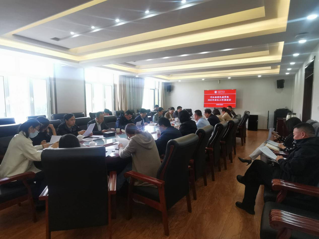 为扎实做好2023年招生工作,4月26日下午学校在办公楼2楼会议室召开2023年招生工作委员会会议。校长韩伟新出席会议并讲话,副校长纳丽娜主持会议。学校招委会成员、二级学院院长及教务处相关人员参加此次会议。