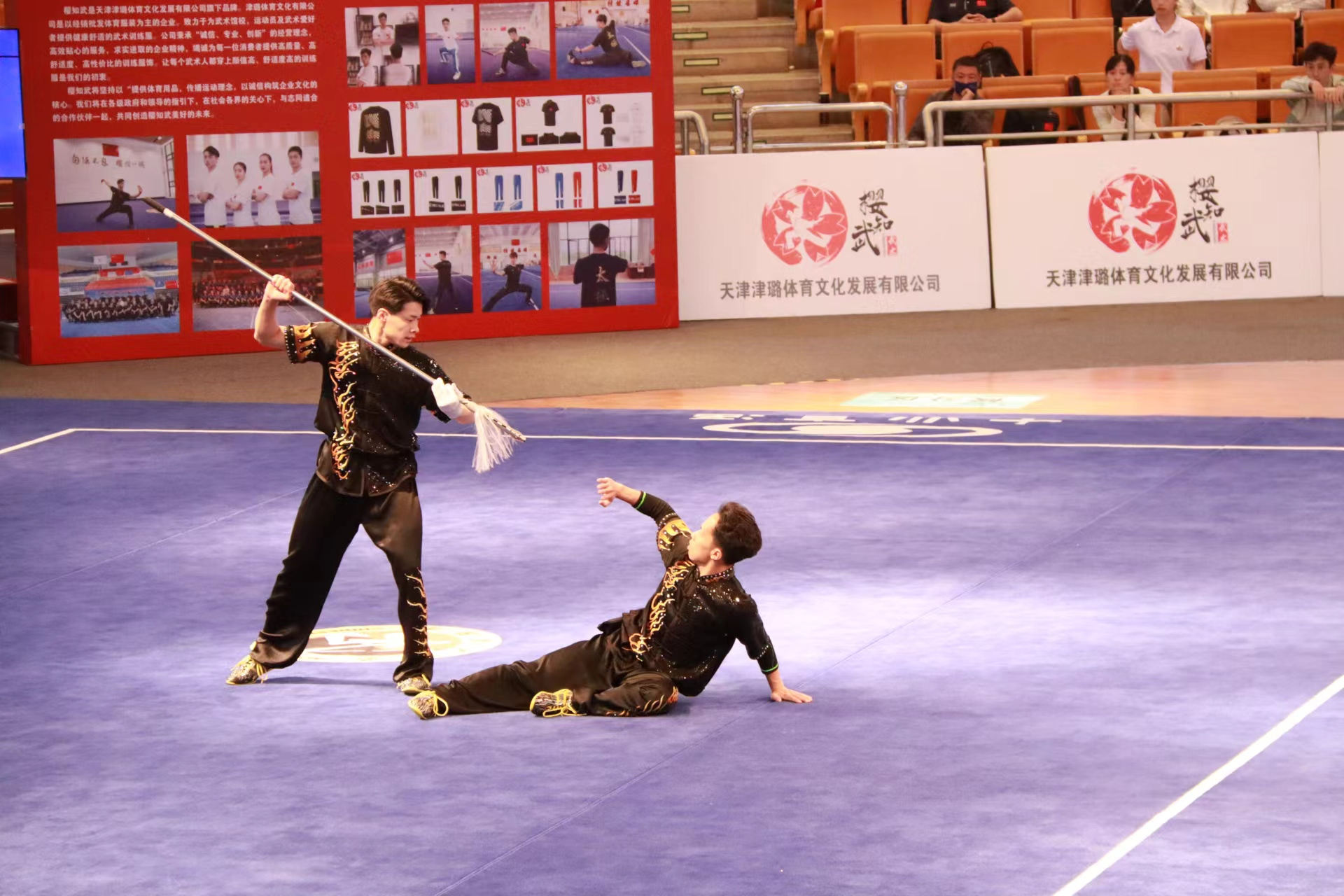 在比赛首日男子对练项目中学校武术队边佳选、孟祥然同学旗开得胜,勇夺金牌!