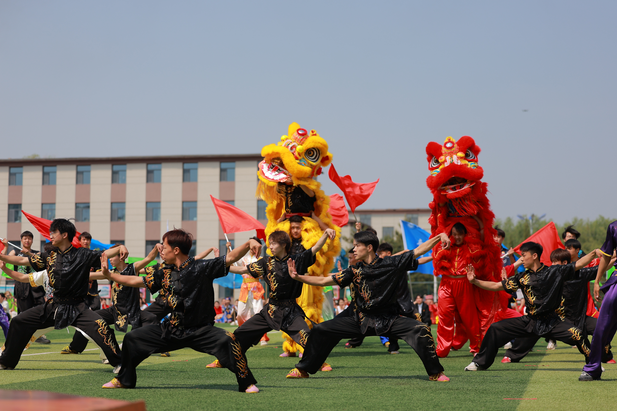 国旗护卫队踏着整齐划一的步伐,昂首阔步入场。彩旗队、马术队、石榴籽方队、武术队、搏克队、射箭队、布鲁队、喜塔尔队、包根吉日格队、沙嘎队、抢枢队方队依次入场。