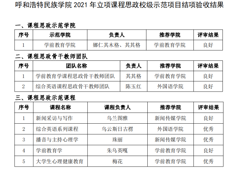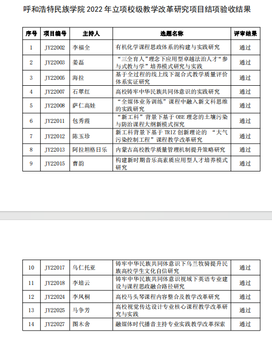 根据《关于开展best365官网中文版登录 2024 年课程思政示范建设项目结项及中期检查工作的通知》(呼和民院教务〔2024〕36 号)和《关于开展 2024 年度best365官网中文版登录教学改革研究项目申报立项与结项验收工作的通知》(呼和民院教务〔2024〕41 号),学校组织教学指导委员会开展了2021 年立项的课程思政校级示范项目、2022 年立项的校级教学改革研究项目结项验收工作。现对评审结果予以公布(名单详见附表)。