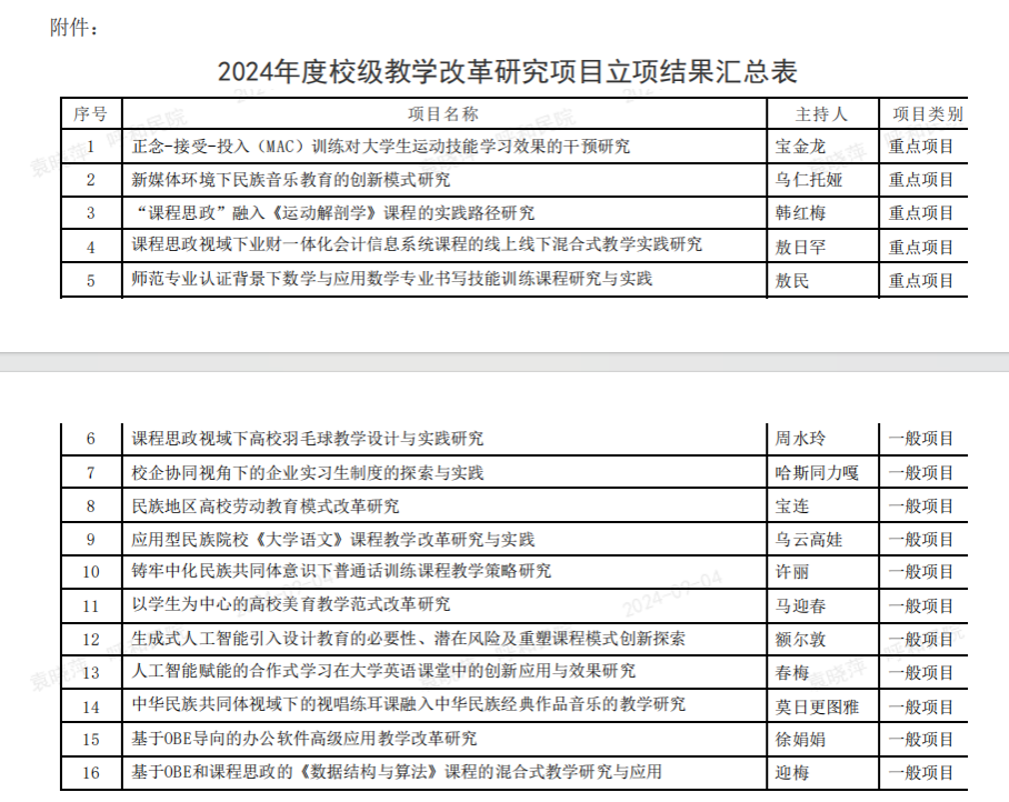 根据《关于开展2024年度best365官网中文版登录教学改革研究项目申报立项与结项验收工作的通知》(呼和民院教务〔2024〕41号)要求,经个人申报、学院(部门)推荐、教务处资格审核、学校教学指导委员会评审、公示无异议后遴选出“正念-接受-投入(MAC)训练对大学生运动技能学习效果的干预研究”等16个项目立项(具体名单见附件)为best365官网中文版登录2024年度校级教学改革项目,现对立项结果予以公布。