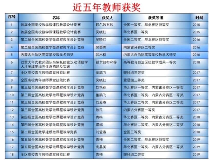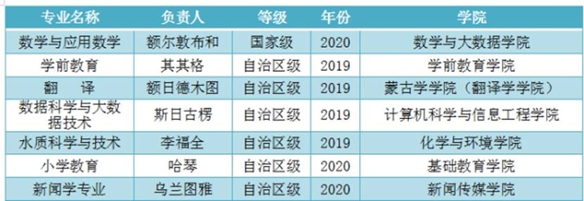 天道酬勤,一树百获。近几年,该专业师生先后获得全国高校数学微课程教学设计竞赛全国一、二等奖;全国大学生数学建模竞赛二等奖等50多项省部级各类奖项;现有自治区高等学校在线开放课程2门(2018年)和精品在线开放课程(金课)1门(2021年);建设自治区高等学校实验教学示范中心(2017年)1个和教育部民族教育发展中心重点研究基地(2015年)1个,挂靠学校成立内蒙古高等教育学会数学教育分会(2016年);先后20多名学生考取太原理工大学、陕西师范大学、内蒙古大学等高校硕士研究生,其中3人分别直推为武汉科技大学和内蒙古大学的博士研究生。特别是,2018年实现学校高等教育自治区级教学成果一等奖零的突破。
