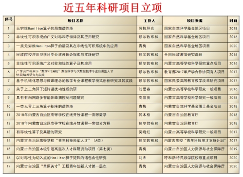研精殚思,硕果累累。近五年,该专业团队成员先后获批国家自然科学基金项目3项、全国民族教育研究课题1项、教育部协同育人项目1项、自治区人才项目2项、自治区自然科学基金项目2项和其它省部级教学科研项目20多项;在《中国科学》《数学学报》《journal of mathematical analysis and applications》等国内外刊物上发表学术论文70多篇,其中SCI收录30多篇;出版教材和专著5部;邀请中国科学院张恭庆院士等国内外专家学者40余人次,组织参加各类教学科研会议50余人次,承办第八届非线性数学物理国际会议暨全国第十五届可积系统学术研讨会(2019年)等会议。2019年,数学学科获批为国家民委重点学科。