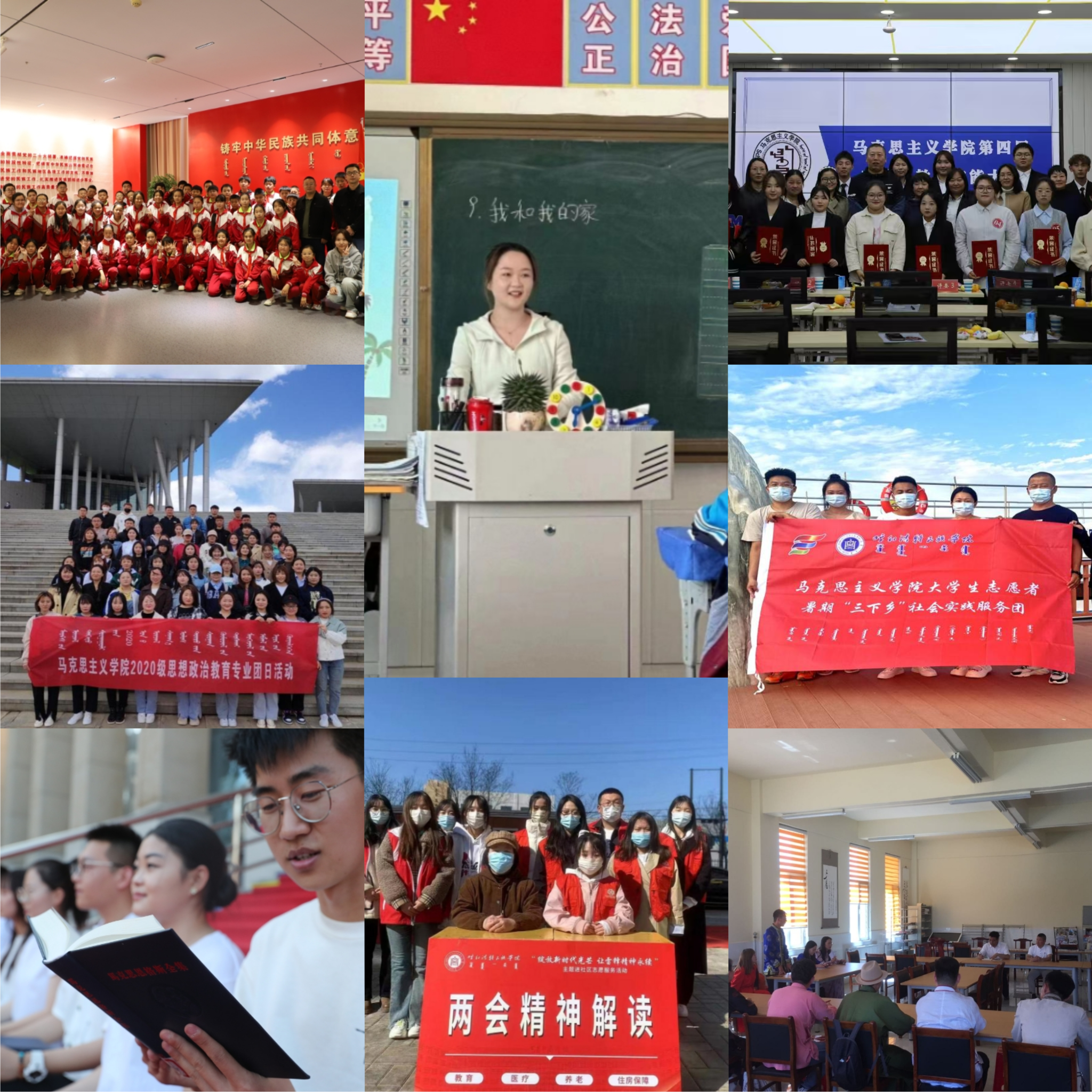 本专业注重实践性,在呼和浩特市、鄂尔多斯市鄂托克前旗、杭锦旗、兴安盟科右前旗、科右中旗、通辽市科左后旗、通辽市库伦旗设有28个实习(实训)基地,为学生提供了良好的实习、实训平台。近年来,本专业学生参加全国高校思政教育师范生技能测试暨微课比赛二等奖1人、三等奖5人;参加自治区大学生讲思政课比赛获一等奖2项、二等奖5项、三等奖5项;参加学校师范生技能大赛获得一等奖4人、二等奖3人、三等奖5人;参加“挑战杯”全区大学生创业计划竞赛获得三等奖3项;参加学校第六届互联网+大学生创新创业大赛获得三等奖1项,获批自治区级大学生创新创业训练项目4项,校级训练项目2项。2016级思想政治教育班获全国活力团支部奖,马克思主义学院志愿者服务队获得2019年全区大中专学生志愿者暑期“三下乡”社会实践活动“优秀志愿者服务队”等荣誉。