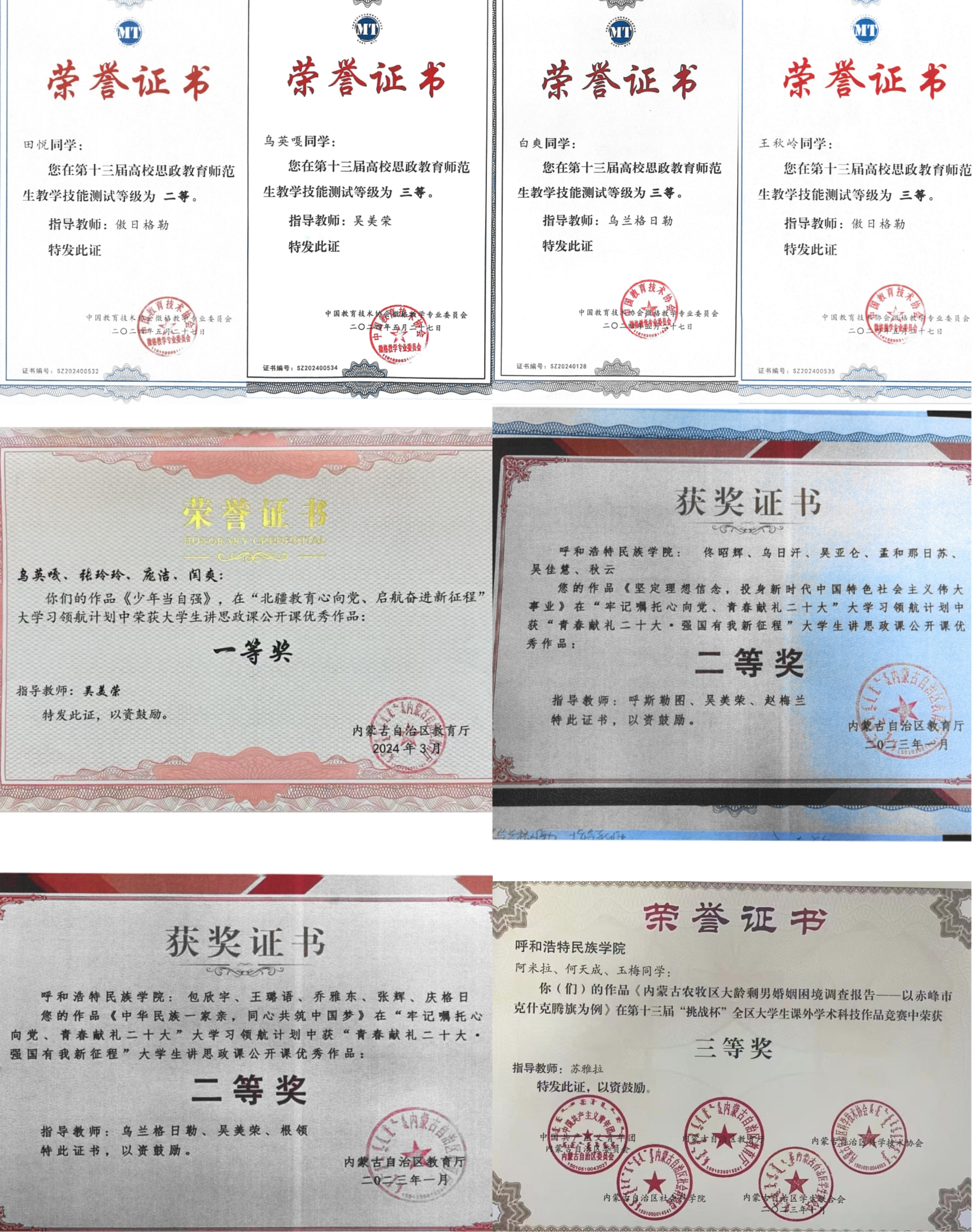 目前,学院拥有一批学位、年龄、职称合理的优秀教师团队。教职员工33人,其中教授6人,占比18.2%;副教授6人,占比18.2%;博士11人,占比33.4%;硕士20人,占比63.6% ,高层次人才储备充足;硕士生导师4人、校外兼职博士生导师1人、硕士生导师8人,特聘教授2人,银龄教师1人,为人才培养注入多元智慧。团队中涌现出一批国家级、省部级优秀人才:荣获全国优秀社科普及专家、享受国务院政府特殊津贴专家、自治区“草原英才”、自治区有突出贡献的中青年专家、内蒙古青年“五四奖章”、入选自治区意识形态领域“四个一批”人才、自治区新世纪“321人才工程”一层次人才、自治区高等教育“111工程”二层次人员1人;入选自治区草原英才创新创业人才、科技英才1人,自治区高校优秀思想政治理论课教师2人、自治区高校最美思政课教师、“尽职圆梦践行者”—北疆最美教师1人,自治区高校优秀辅导员1人,自治区高校党课名师1人,自治区高校铸牢中华民族共同体意识课程“示范性种子”教师2人,近五年获得全区高校思政课程和课程思政教学技能大赛二等奖1人,获得自治区高等院校青年教师技能大赛二等奖2人,自治区本科高校教师教学创新大赛中获得一等奖1人。学院始终坚持“以教促研,以研促教”的原则,不断推动教学科研发展。专任教师中主持国家社科项目13项,教育部一般项目3项,国家民委项目3项,省部级重点项目4项,一般项目40余项,出版专著9部,主编教材5部。获自治区哲学社会科学优秀成果二等奖3项,三等奖1项,建设自治区级一流课程1门、自治区在线课程1门、校级在线课程2门、省部级科研创新团队1个、校级科研创新团队3个,校级教学创新团队2个。