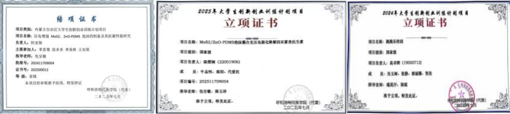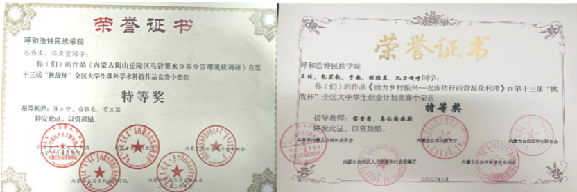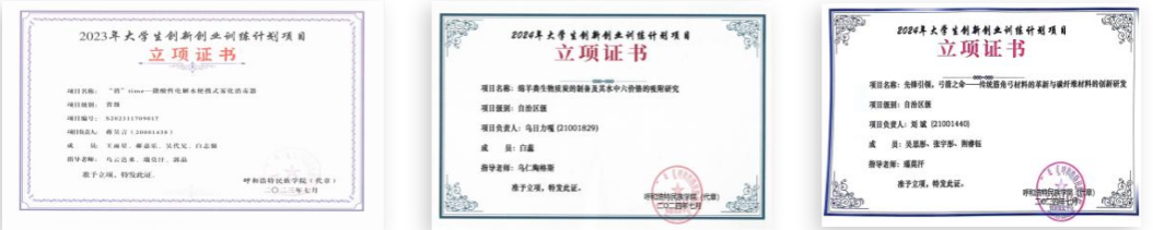 学院十分重视对学生专业实践能力和创新创业能力培养。积极发挥科研优势,鼓励教师指导学生开展学术研究,培育了一批自治区级和校级创新课题。教师指导学生获得了大学生创新项目自治区级项目12项,学生发表论文4篇,获得专利2项,学生实践能力和创新创业精神得到了较大提升。