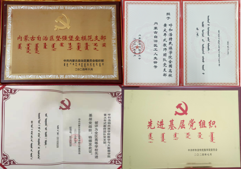 黄大年式教师团队党支部2019年被教育部列为第二批新时代高校党建“双创”工作“全国党建工作样板支部”,同年被中共内蒙古自治区高等学校工作委员会评为全区高等学校先进基层党组织。2021年被中共内蒙古自治区高等学校工作委员会列为“最强党支部”建设单位。2021年4月荣获内蒙古自治区“工人先锋号”称号,2022年4月荣获全国“工人先锋号”称号。2024年,获评“内蒙古自治区坚强堡垒模范支部”,入选全国高校“双带头人”教师党支部书记“强国行”专项行动团队。党支部1人被内蒙古自治区党委授予“担当作为好干部”,6人先后被学校党委评为优秀党务工作者、优秀共产党员。2024年数学与大数据学院党总支获评内蒙古自治区高校党建标杆院系,并被学校党委评为先进基层党组织。