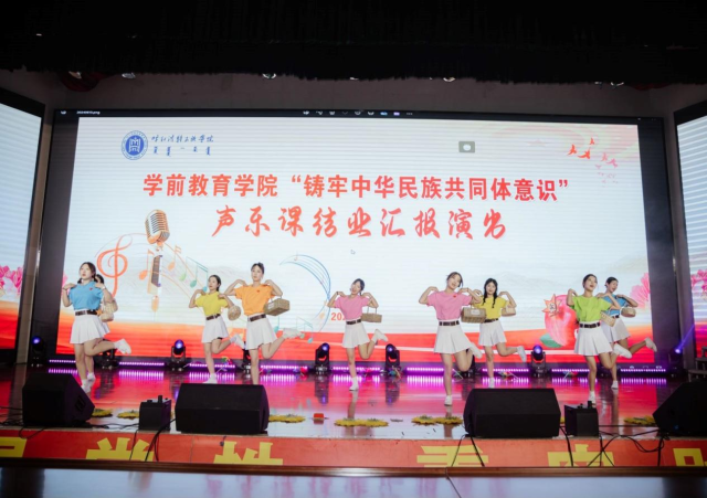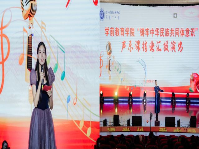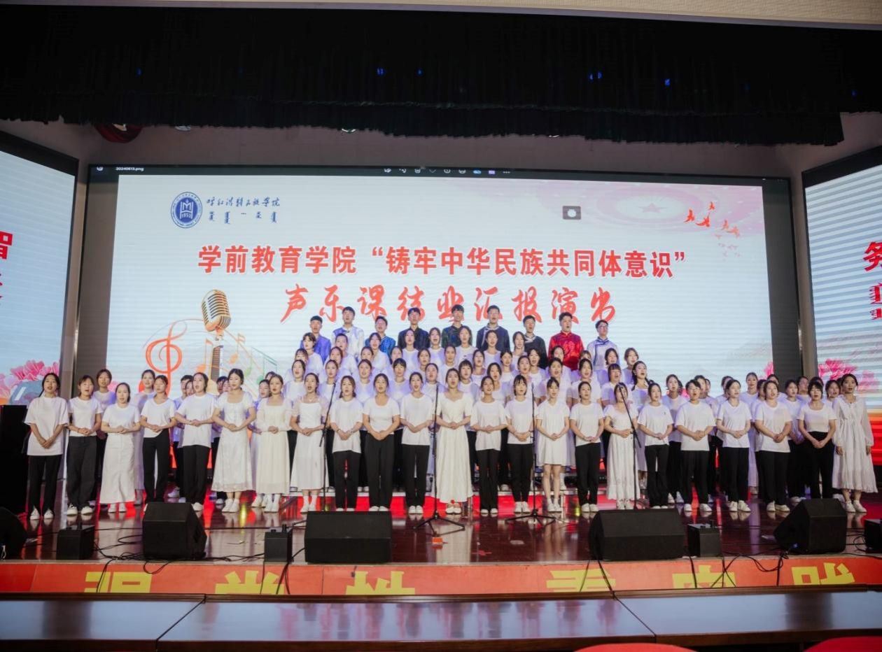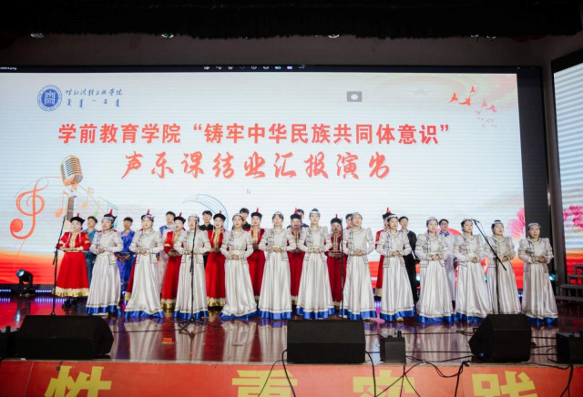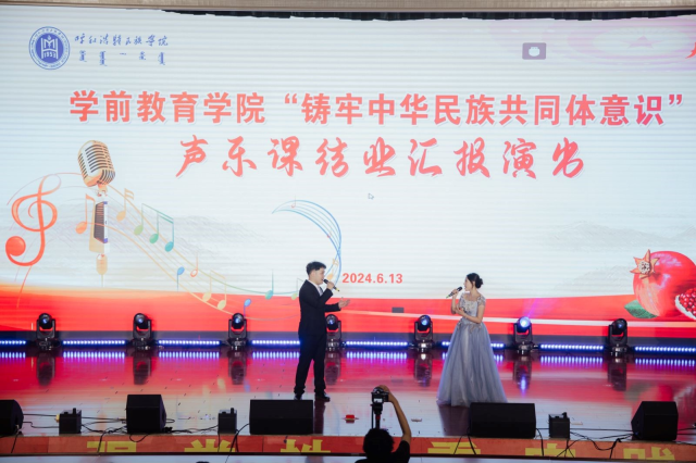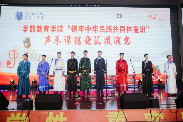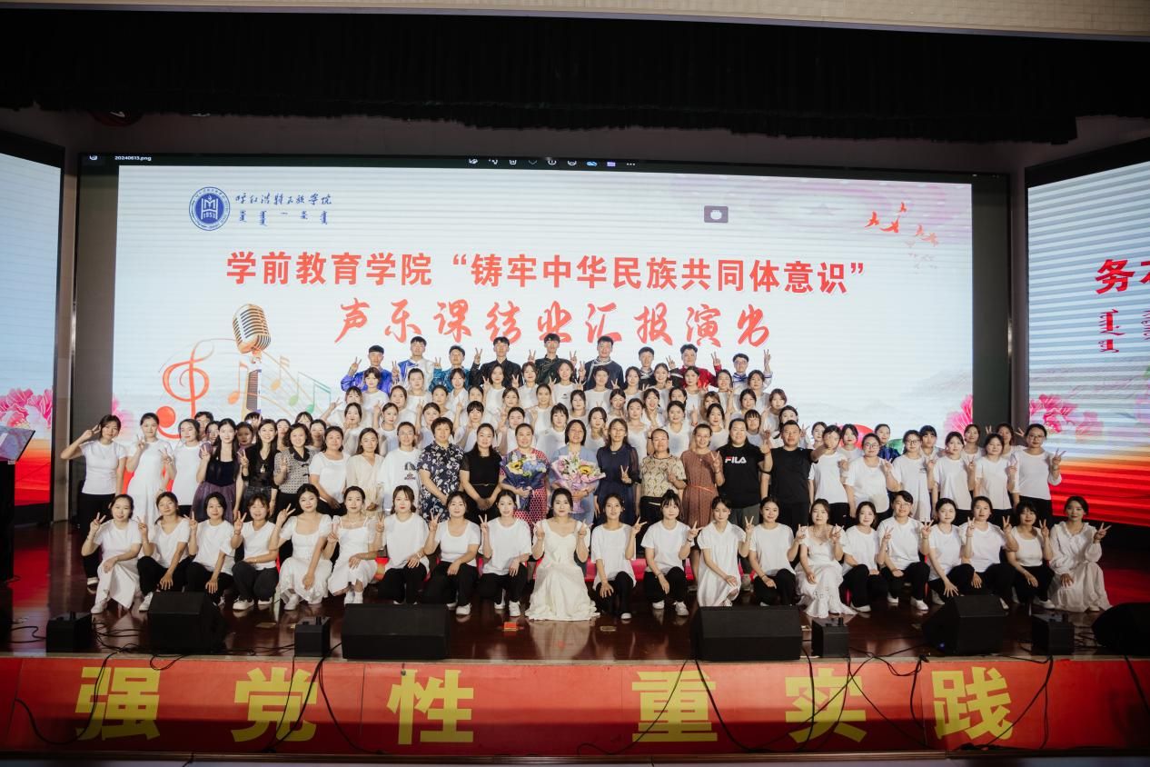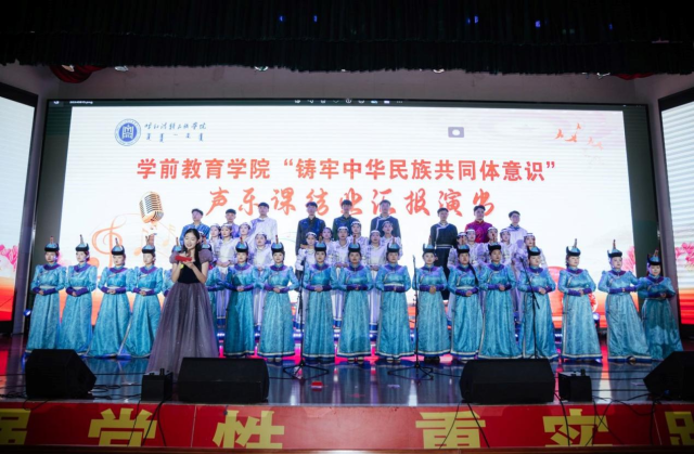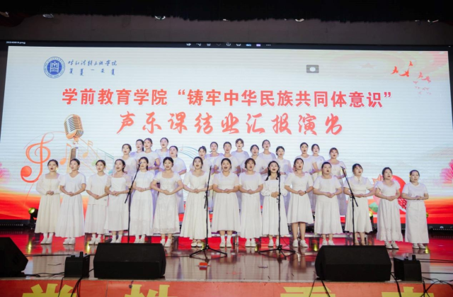 为进一步贯彻落实习近平总书记关于加强和改进民族工作的重要思想,深化我院民族团结进步工作,加强我院师生铸牢中华民族共同体意识教育,学前教育学院2024年6月13日晚19:00时在北图书馆二楼报告厅举办了铸牢中华民族共同体意识主题2021级声乐课结业汇报演出。学前教育学院副院长其其格、新城区第一幼儿园园长计爽,呼和浩特蒙古族第二幼儿园园长乌日勒格以及各二级学院师生共500余人一同观演。本次活动由学前教育学院主办,任课教师萨日胡、梁秀梅老师组织演出。