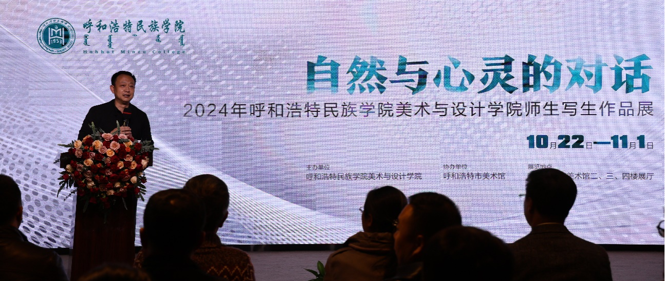 开幕式上,学校党委委员、副校长额尔敦布和教授作致辞。他首先对呼和浩特市美术馆给予学院的大力支持表示感谢,并高度肯定赞扬了此次展览的艺术水准。他指出,写生创作是艺术教学的重要组成部分,是培养学生观察能力和创造力的有效途径。他希望美术与设计学院继续保持锐意进取的精神,深入推进教育教学改革,特别是在写生创作和艺术实践中,不断探索新的教学模式,激发学生的创造力和艺术潜力。同时强调并要求,美术与设计学院要始终坚守文化使命,注重培养学生的民族文化自信,为推动艺术教育事业的高质量发展做出更大贡献。